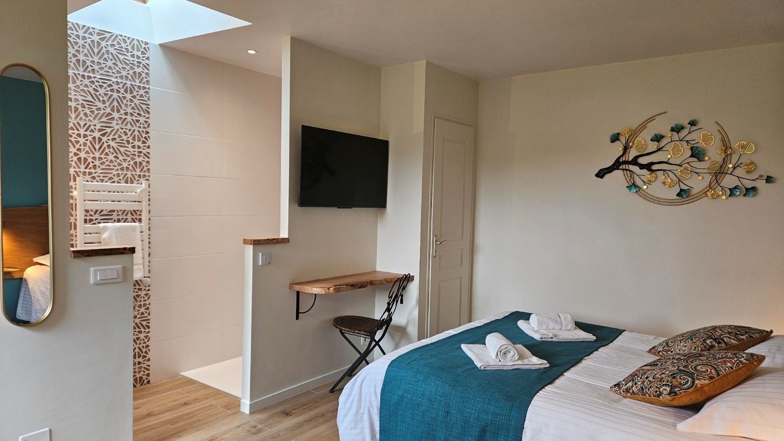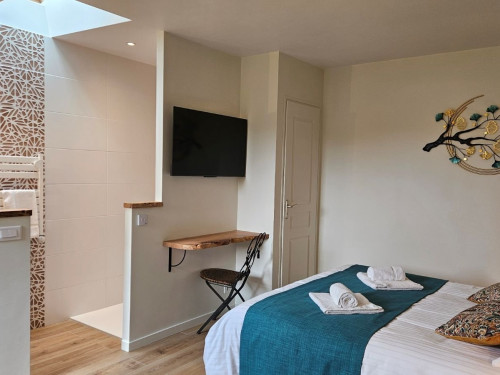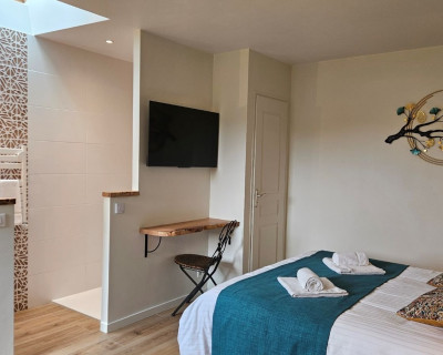 La chambre est orientée plein sud et une terrasse privative en rez de jardin est à votre disposition avec bains de soleil et salon de jardin.