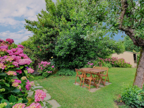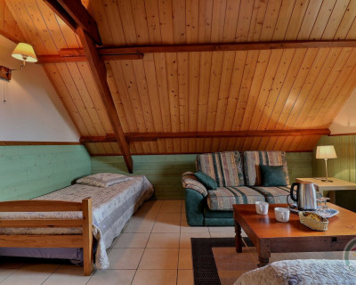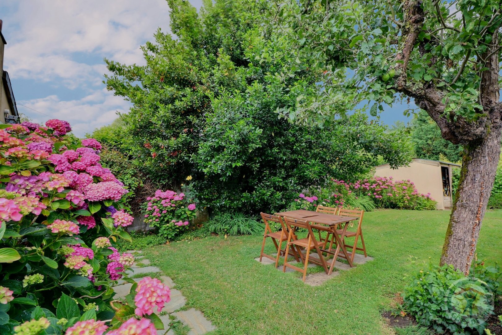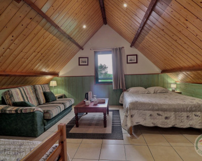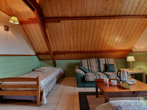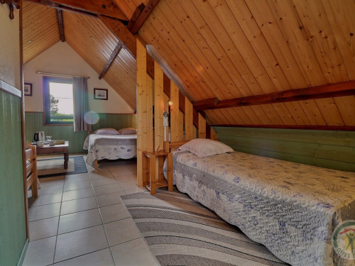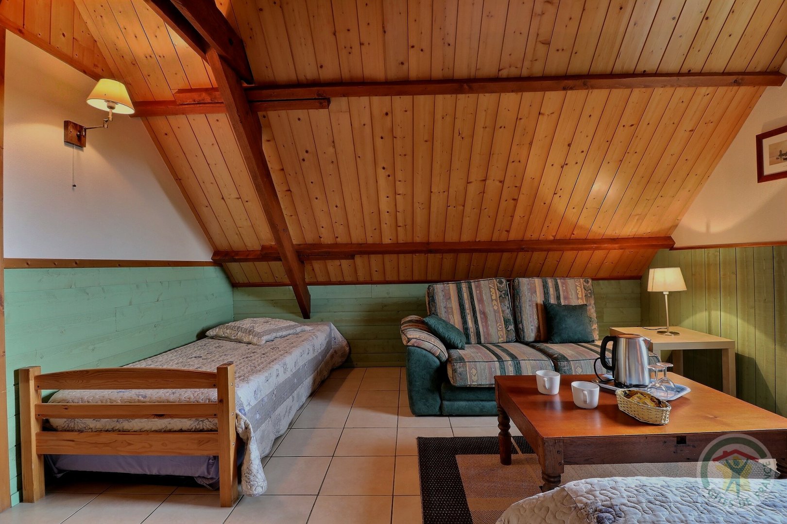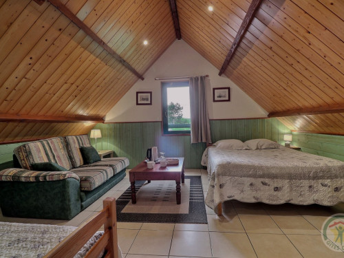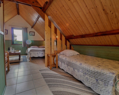 "Chambre Hortensia" : chambre familiale 4 à 5 personnes avec 1 lit de 140 et 2 lits de 90 (possibilité de rajouter un lit de 90) avec entrée indépendante, salle d'eau, douche américaine et WC privés, salon de jardin privés.