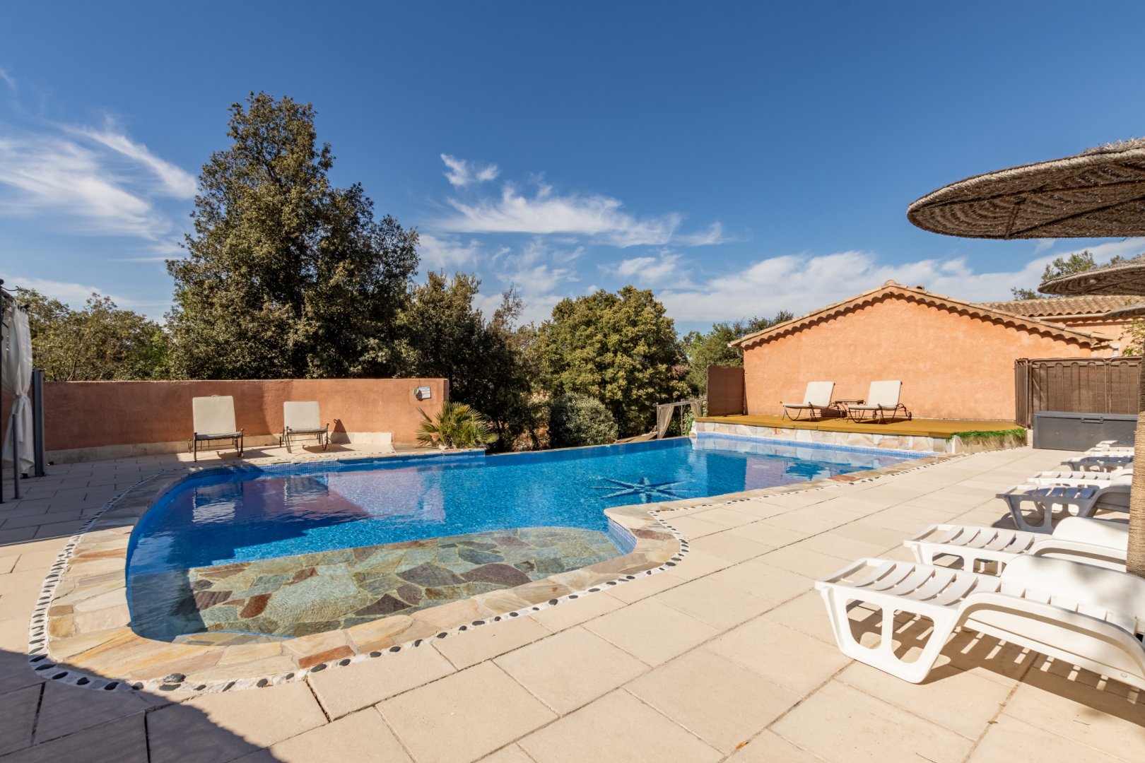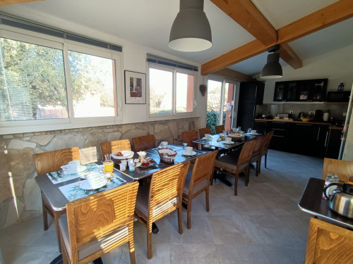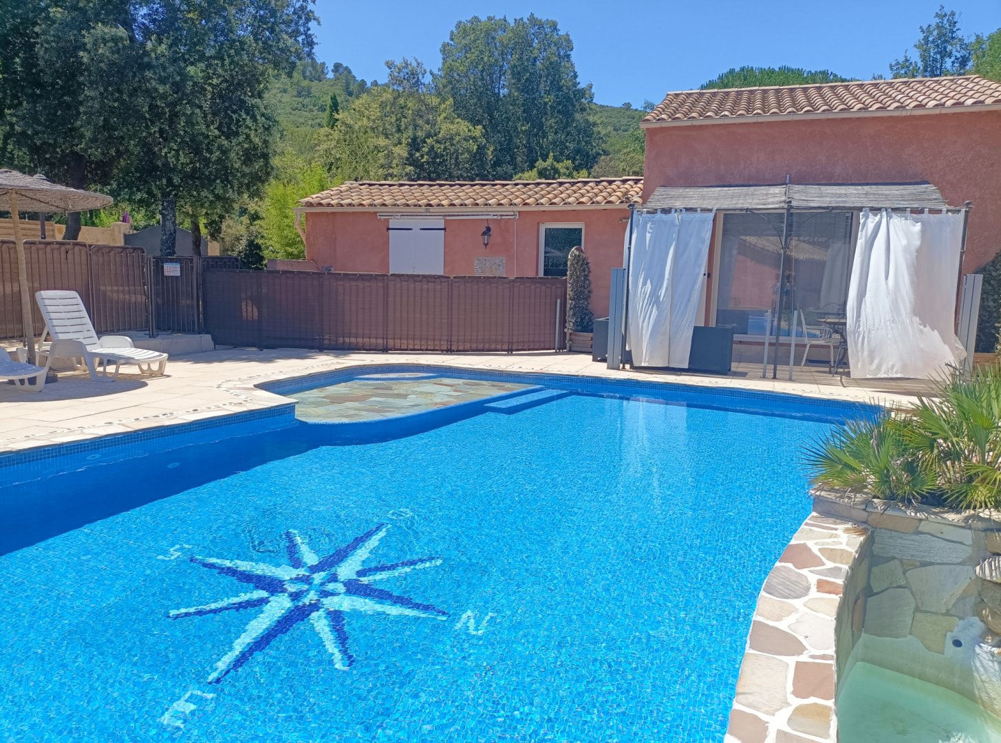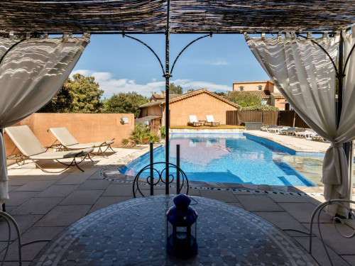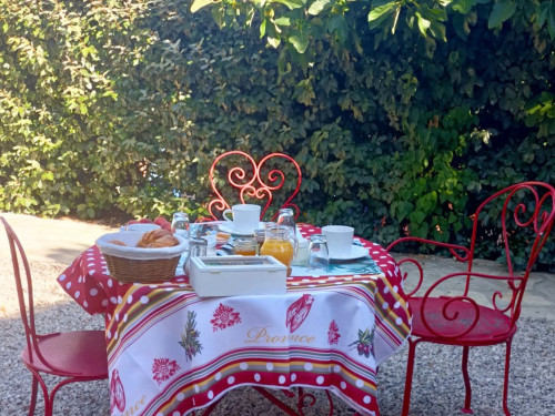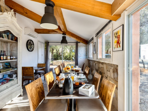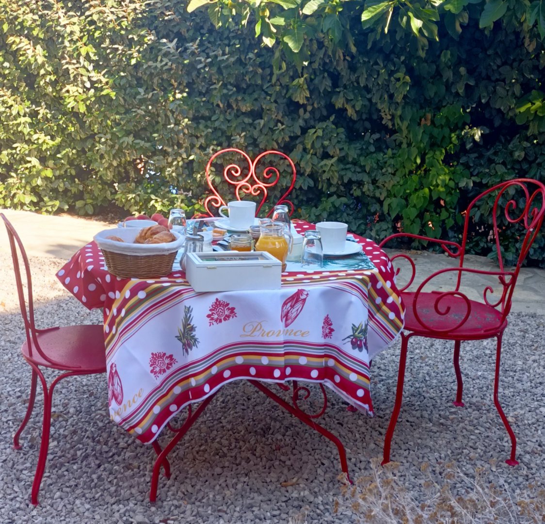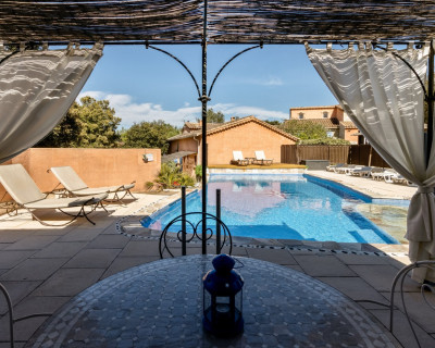 Cette chambre possède sa terrasse privée avec salon de jardin.
