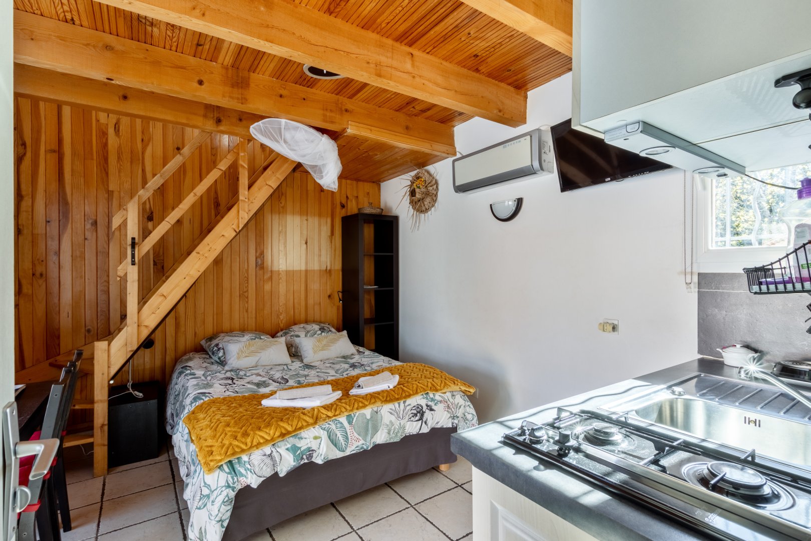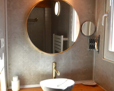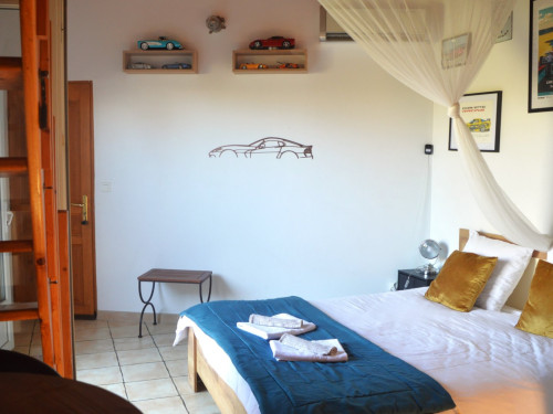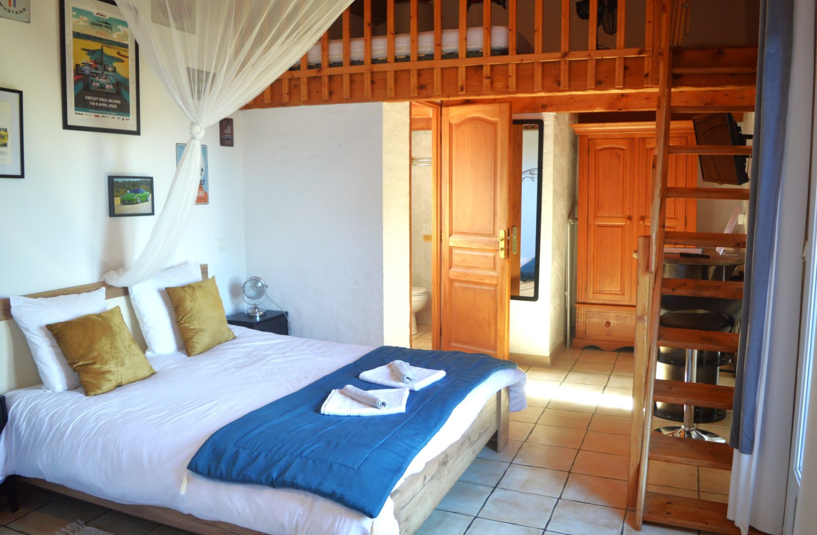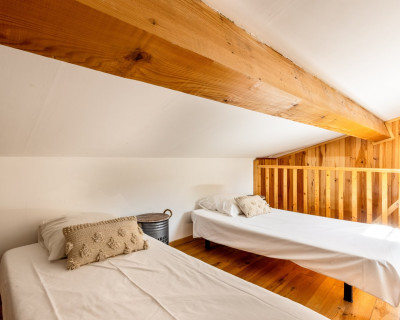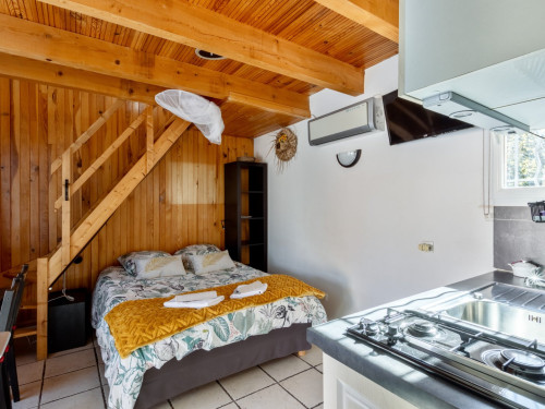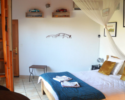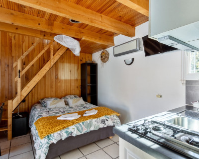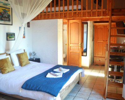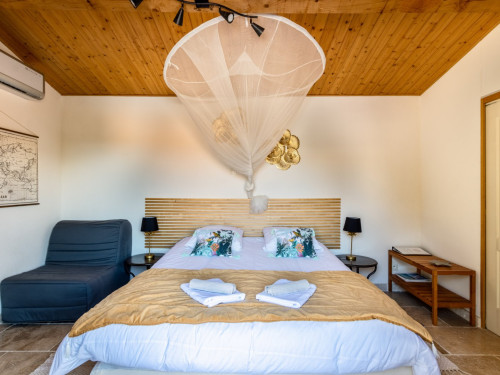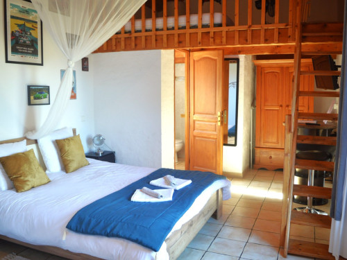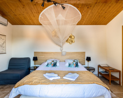 Cette chambre est entièrement climatisée et elle se compose d’une chambre avec un lit double Queen Size, d’une mezzanine avec deux lits simples 90x190 et d’une salle d’eau avec douche, lavabo et WC. Possibilité, sur demande de rajouter un lit bébé.
