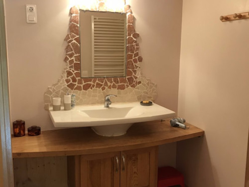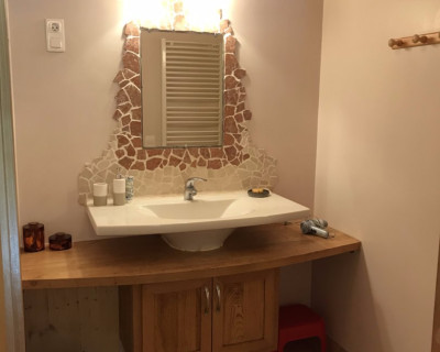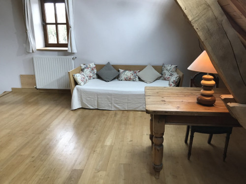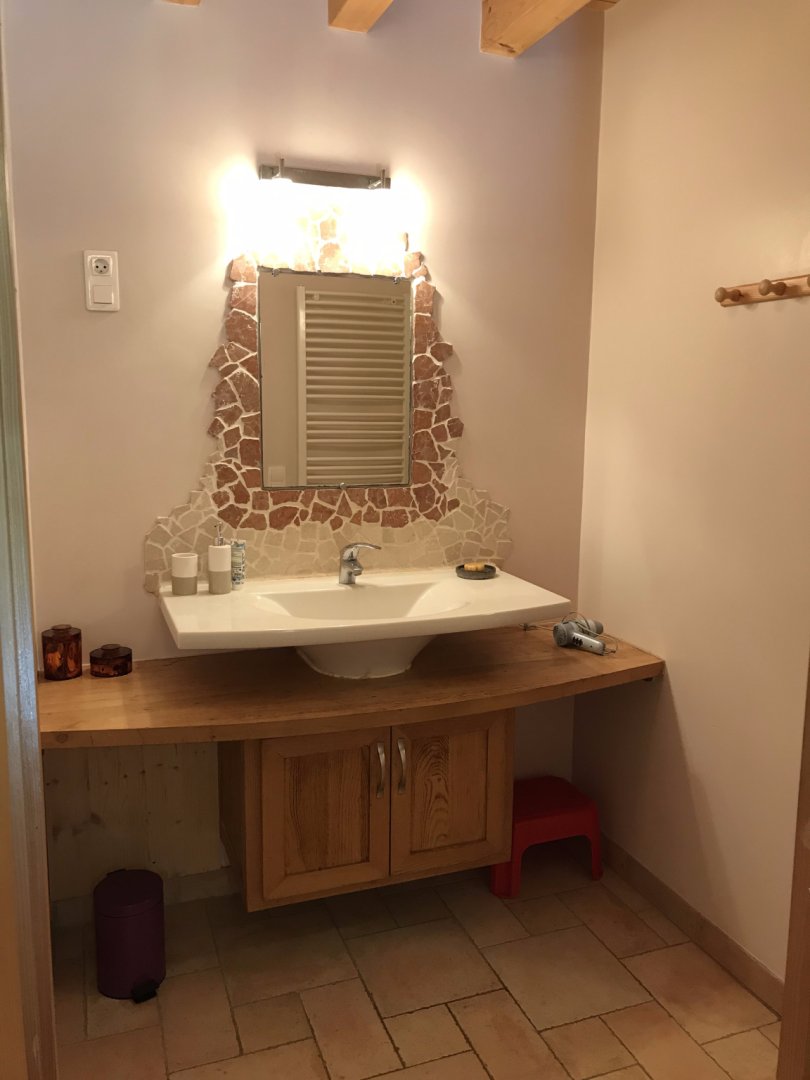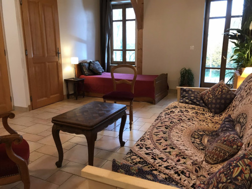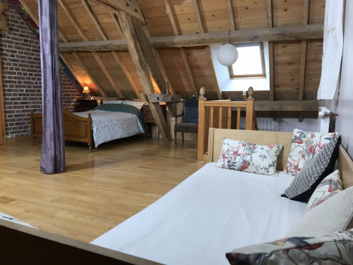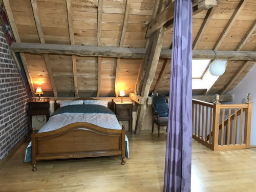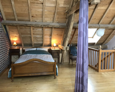Vaste suite privative avec espace "chambre" à l'étage (lit double, lit simple), espace salon au rez-de-chaussée (sofa convertible, lit simple gigogne). Toilettes semi-sèches.