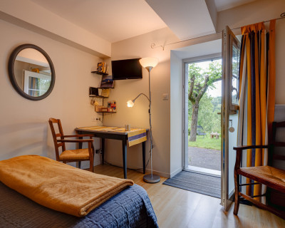 La chambre est au rez-de-chaussée et donne sur le jardin