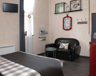 Cette chambre familiale peut accueillir jusqu’à 4 personnes (2 adultes et 2 enfants) en offrant 1 lit double de 160x200 et 2 lits simples (gigogne) de 90x190.