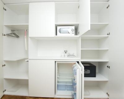 It has an extra-wide LCD TV with cable channels, a microwave and a fridge.