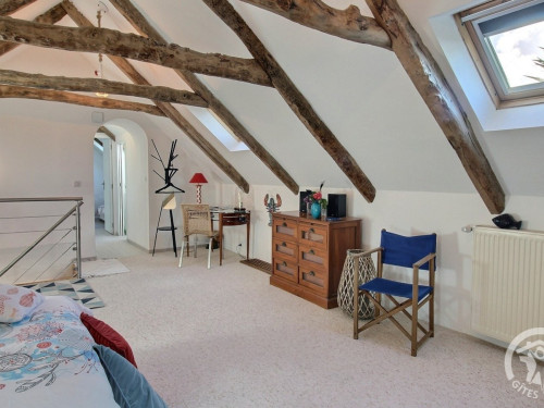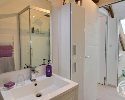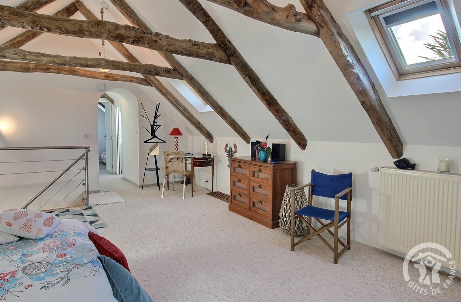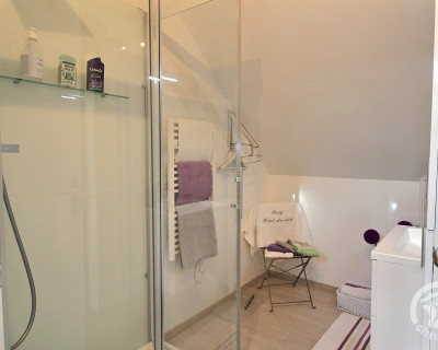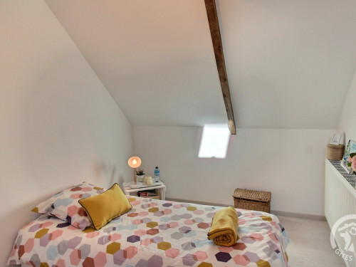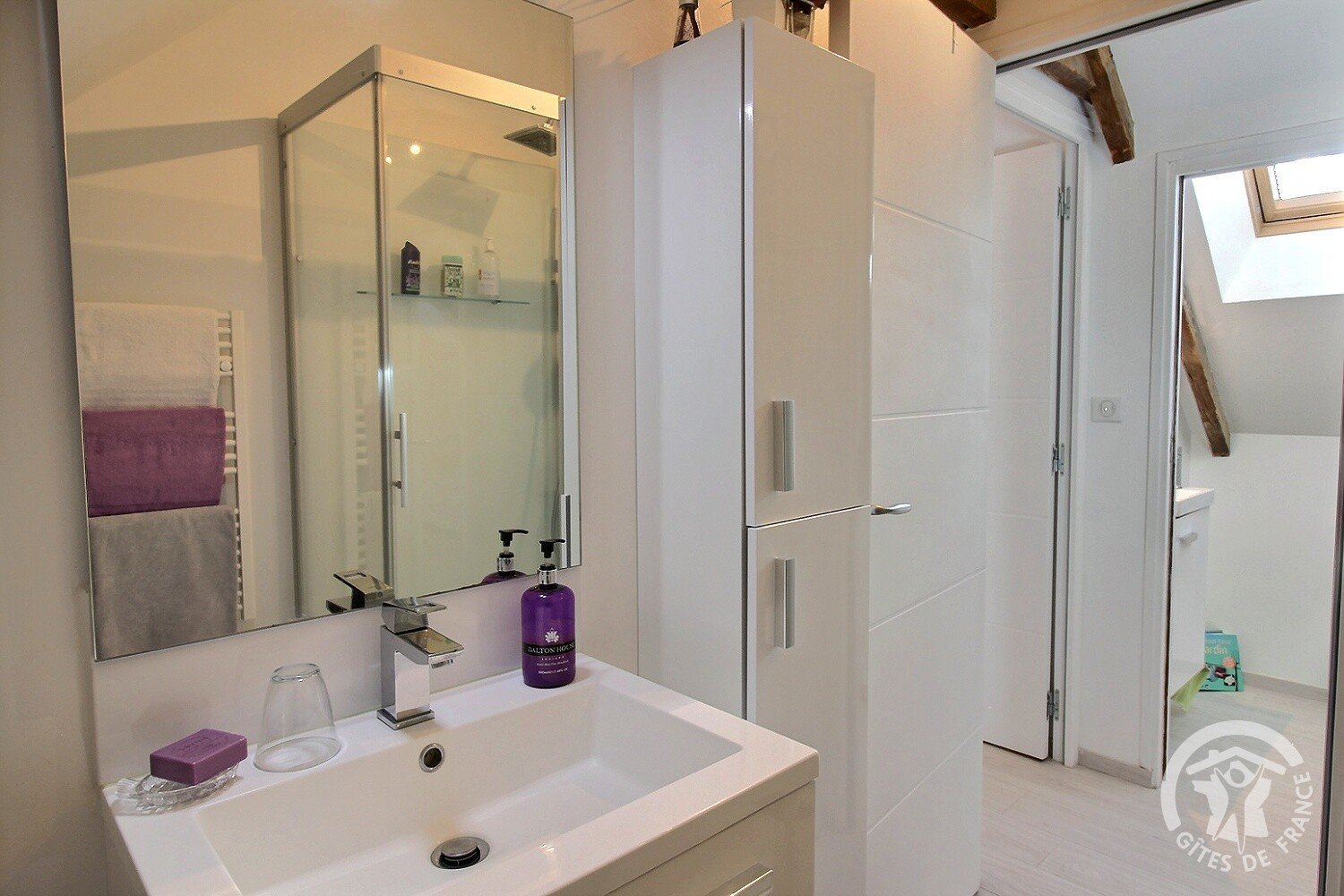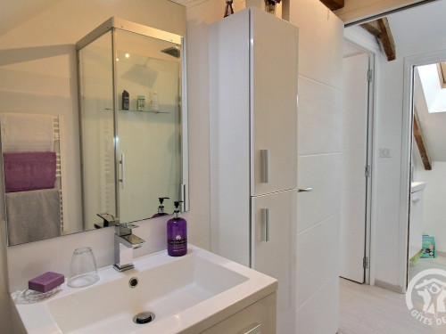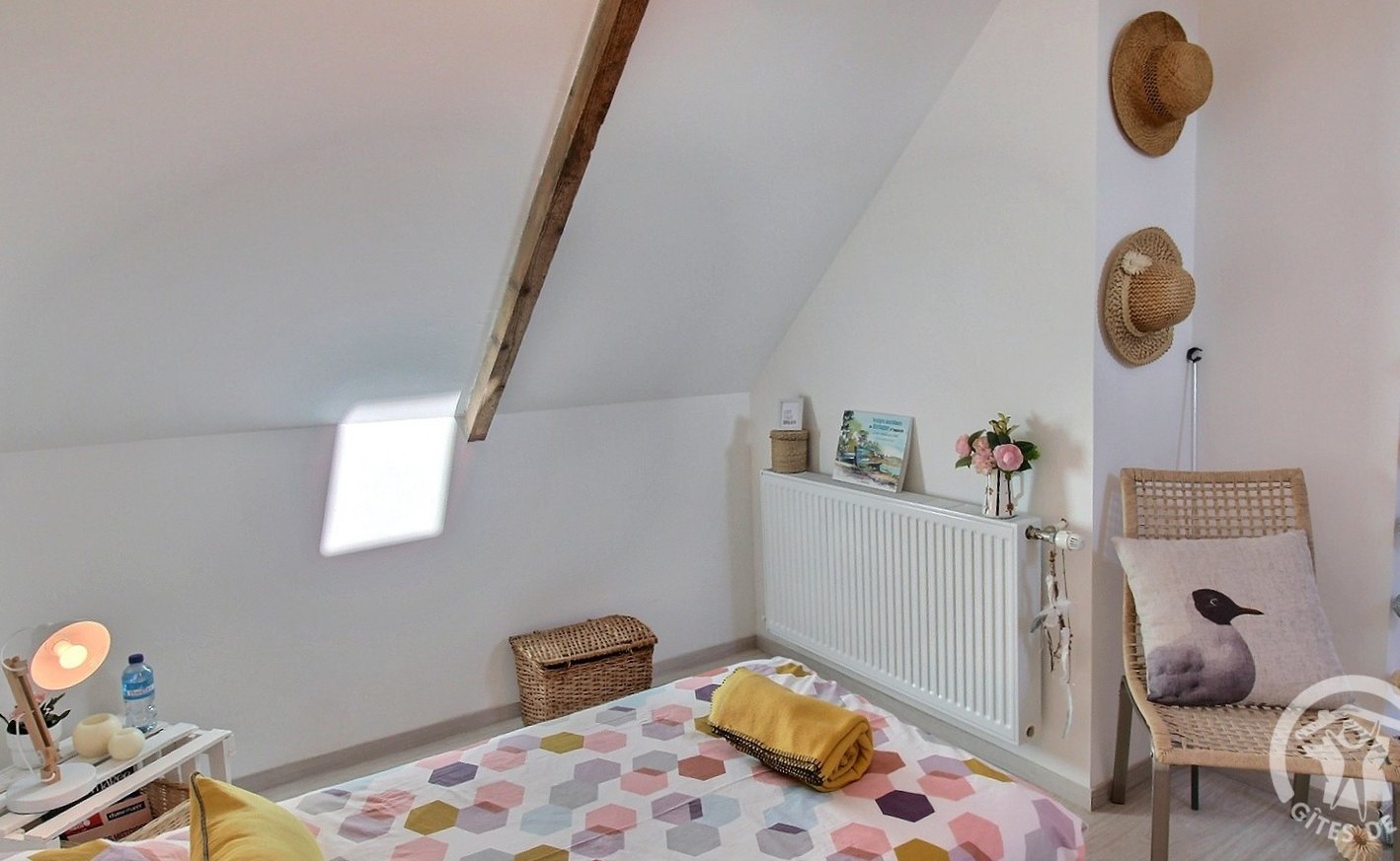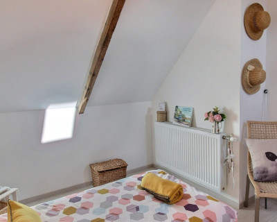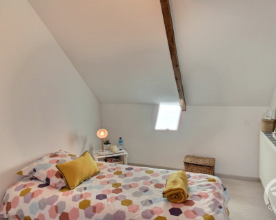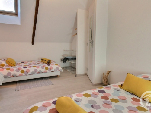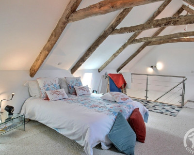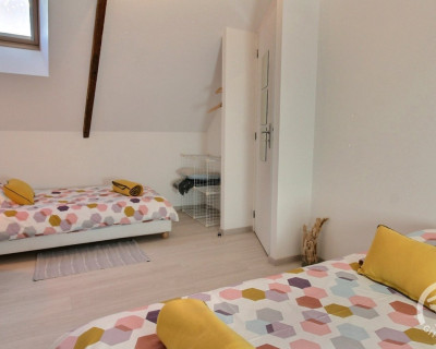 A l'étage : une grande chambre en mezzanine (1 lit 2 pers. en 160x200), une chambre plus petite (avec 2 lit 1 pers. 90X200) jumelables, une salle d'eau avec douche et vasque, un wc séparé.