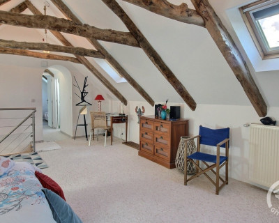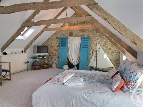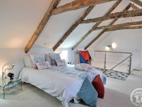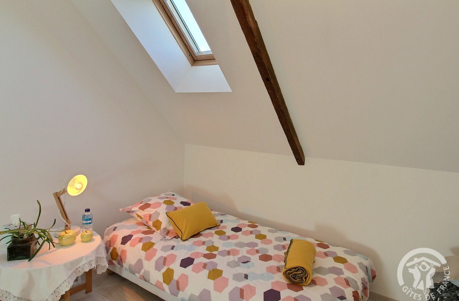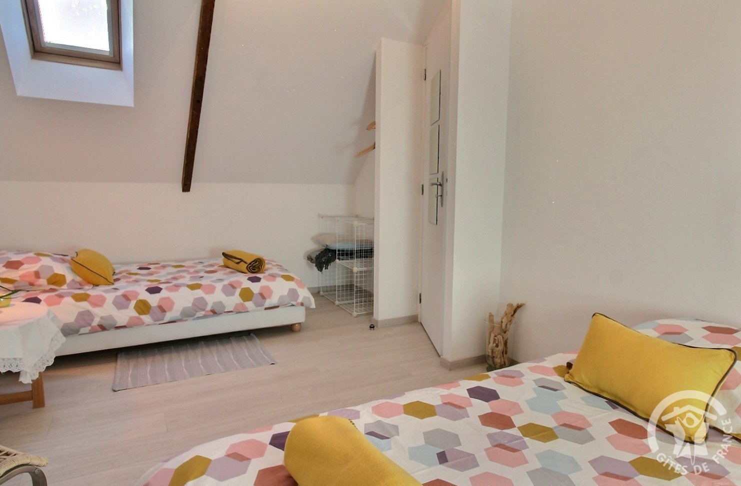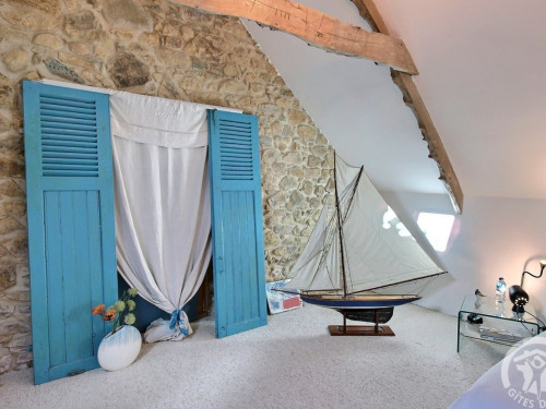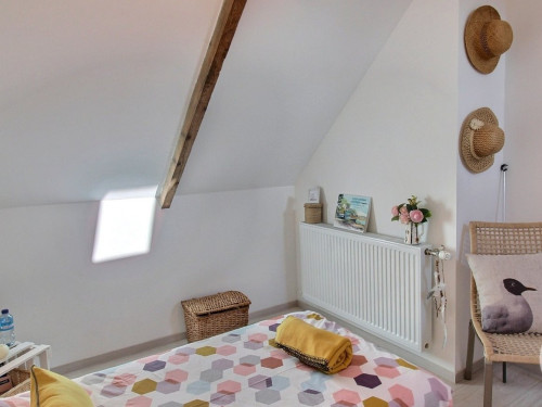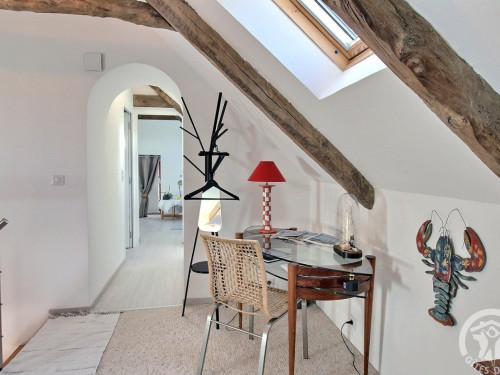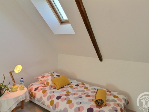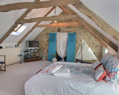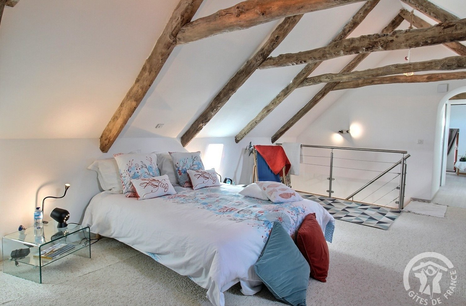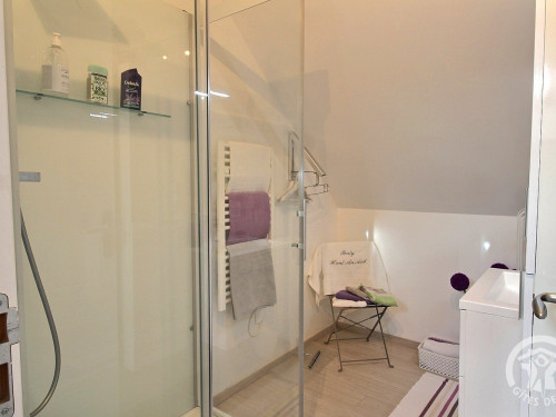 A l'étage : une grande chambre en mezzanine (1 lit 2 pers. en 160x200), une chambre plus petite (avec 2 lit 1 pers. 90X200) jumelables, une salle d'eau avec douche et vasque, un wc séparé.