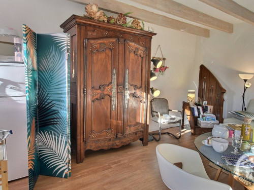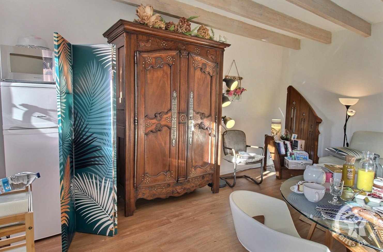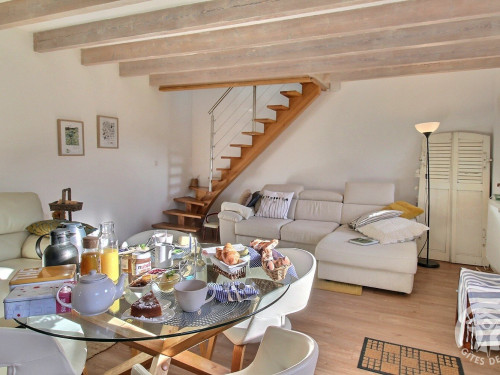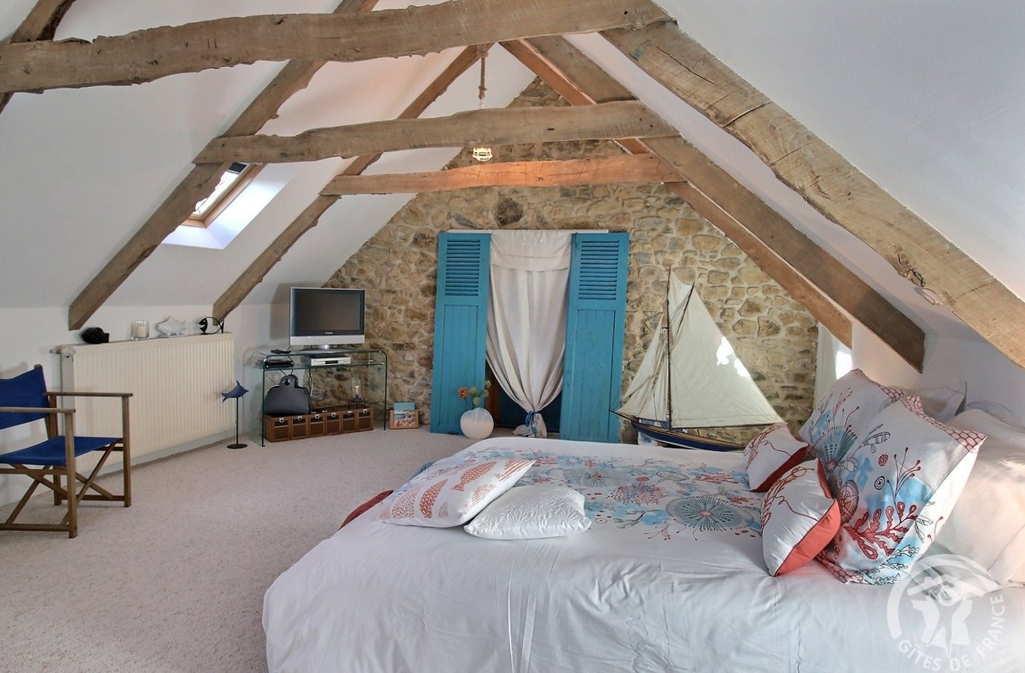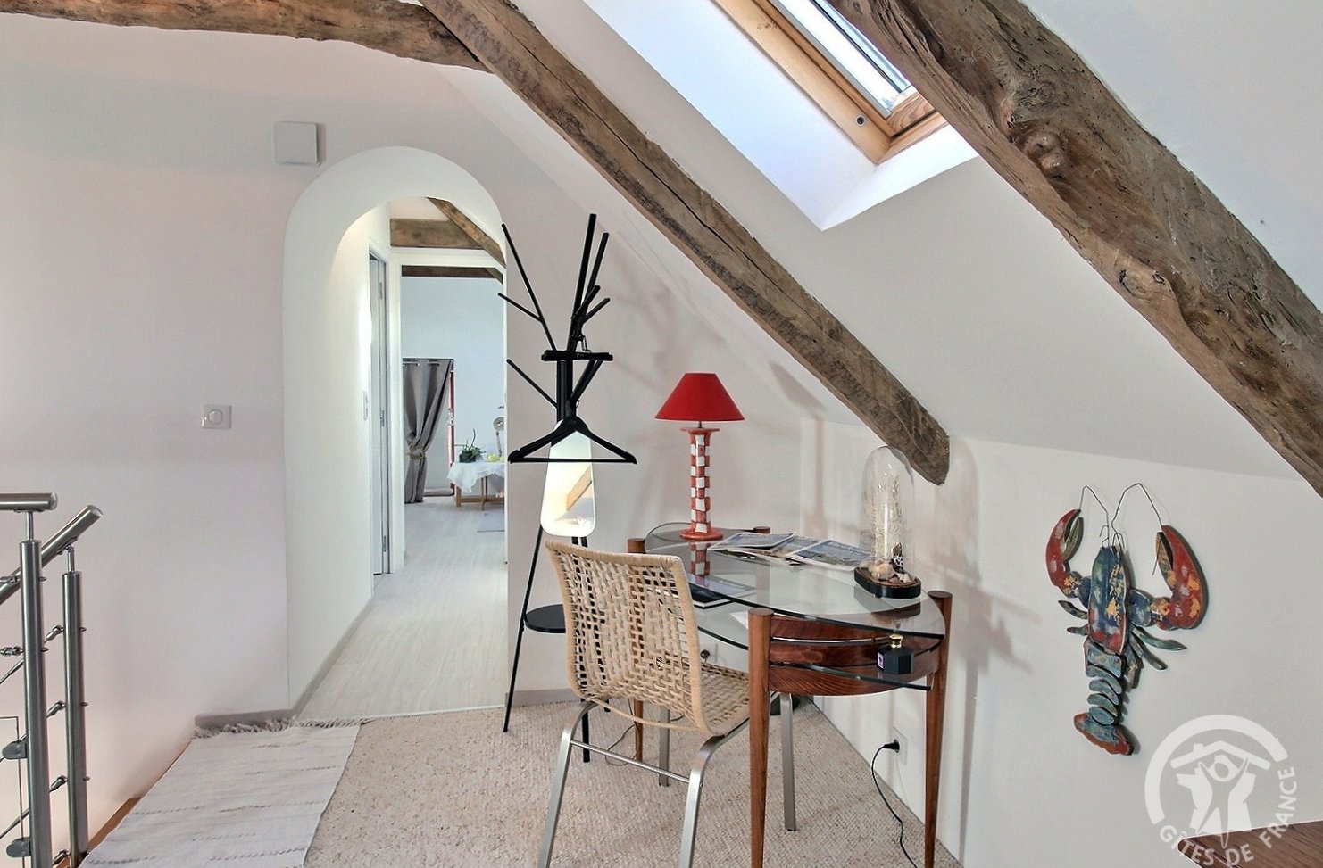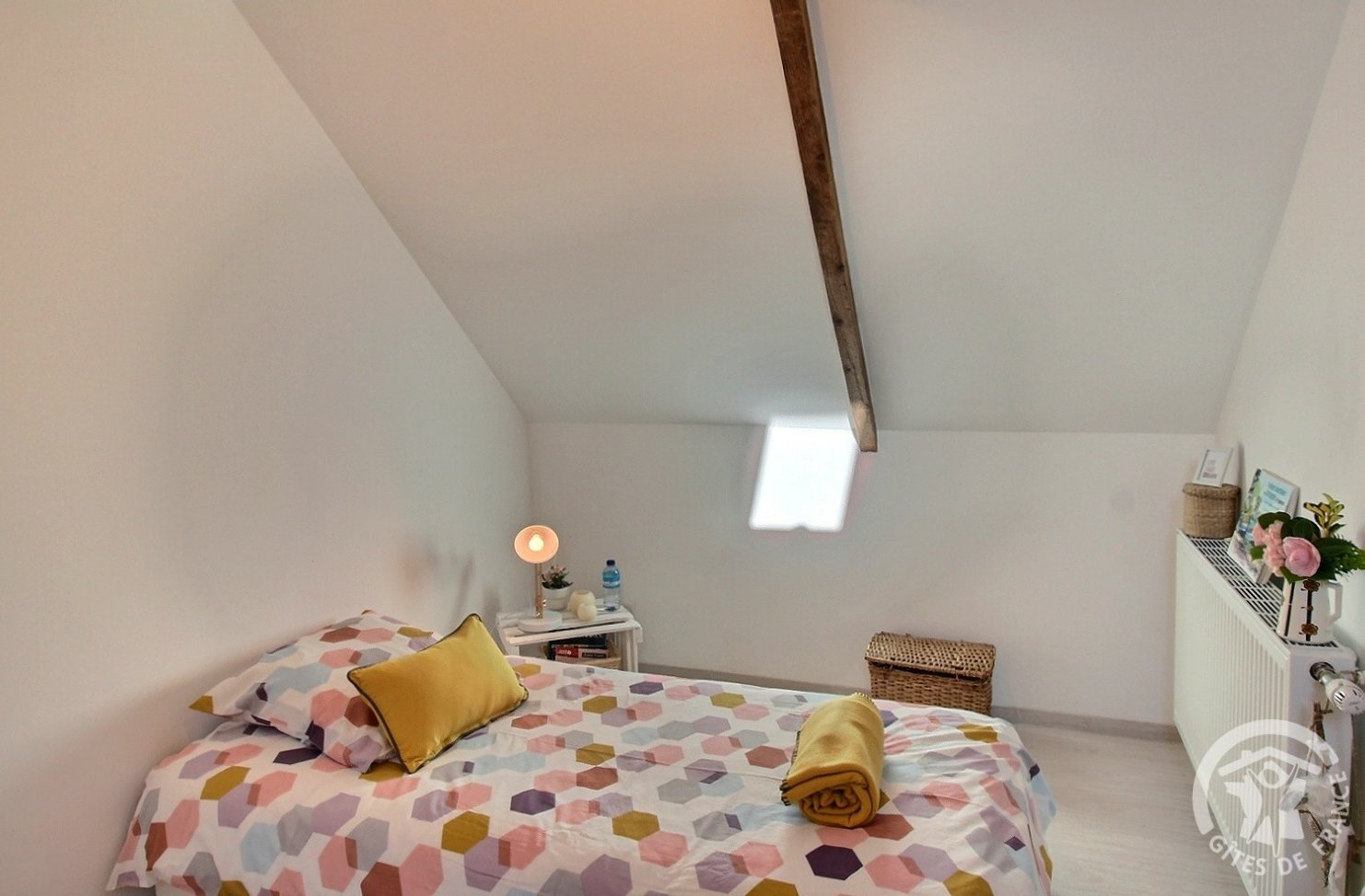 A l'étage : une grande chambre en mezzanine (1 lit 2 pers. en 160x200), une chambre plus petite (avec 2 lit 1 pers. 90X200) jumelables, une salle d'eau avec douche et vasque, un wc séparé.