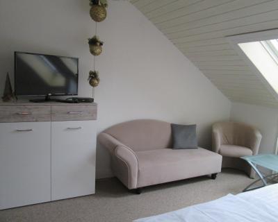La salle de petit-déjeuner peut également être utilisée comme un coin salon commun après le petit-déjeuner. Vous y trouverez également un réfrigérateur avec une sélection de boissons. En été, vous pourrez vous détendre sur la terrasse.