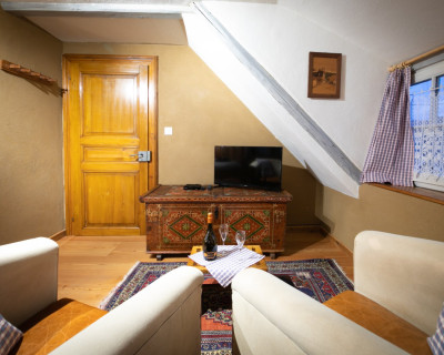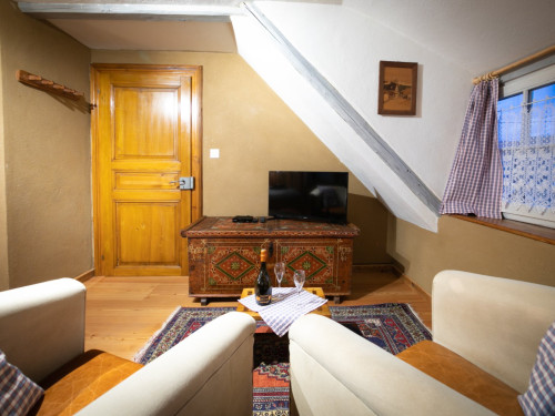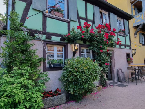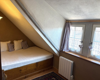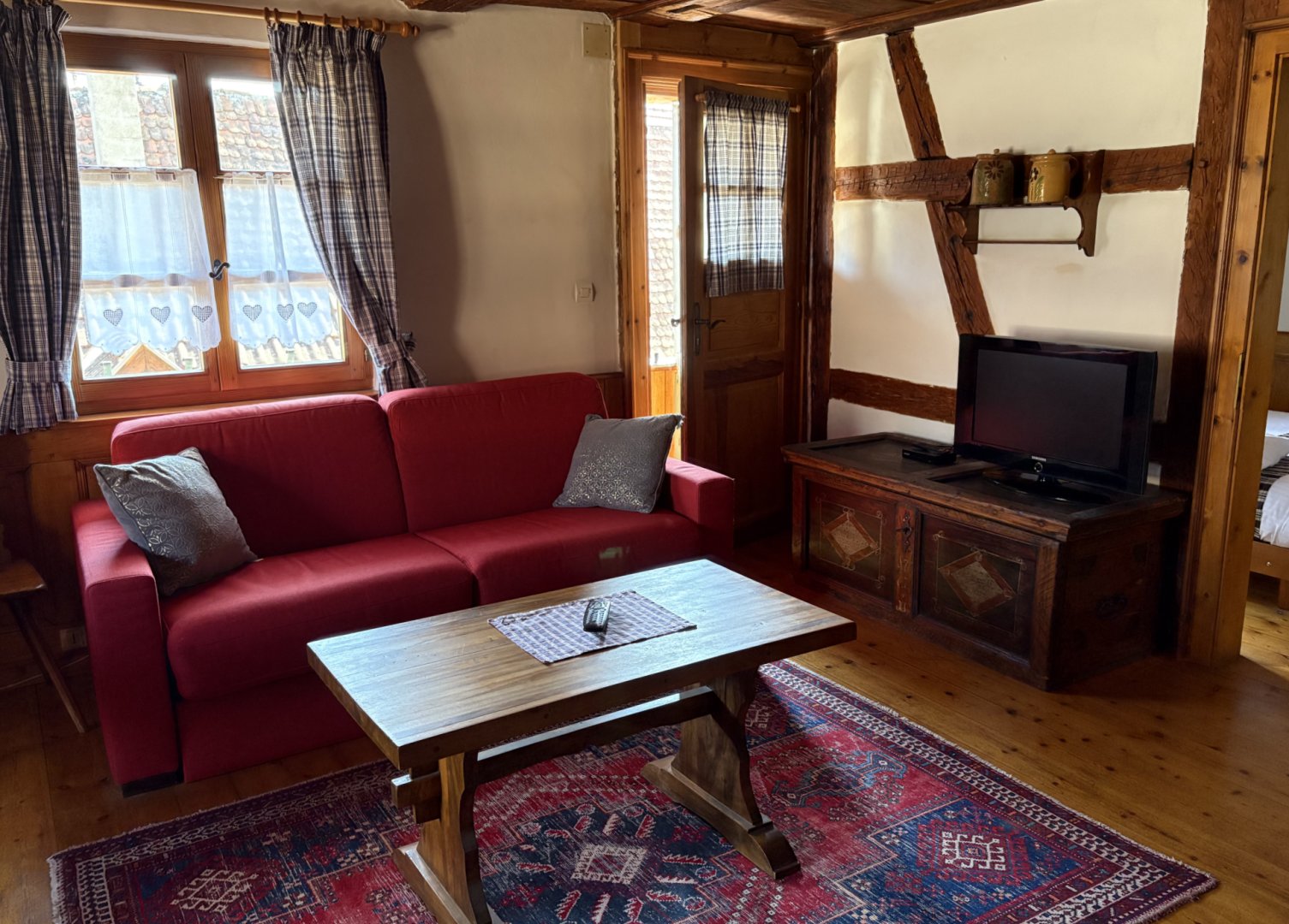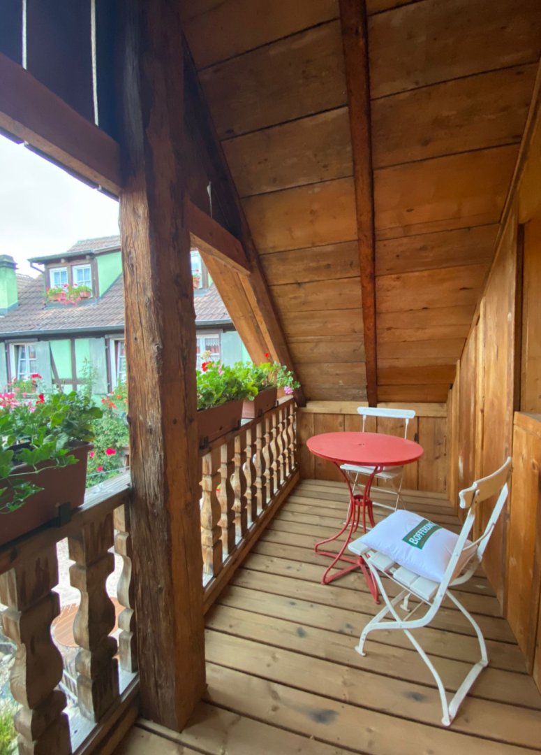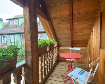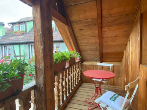 Tel un petit chalet alsacien avec son perron, entrez dans ce mignon logement, un salon confortable avec télévision , salle de bain, et à l'étage une chambre avec son balcon privatif.