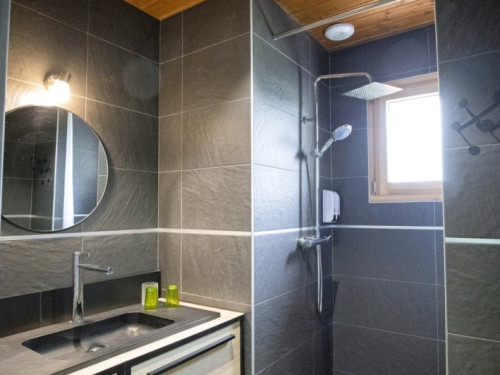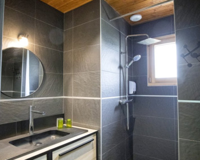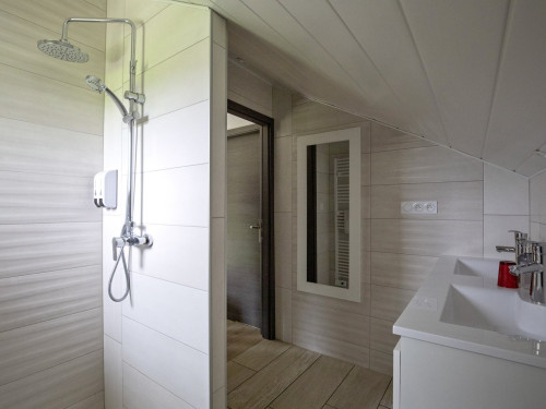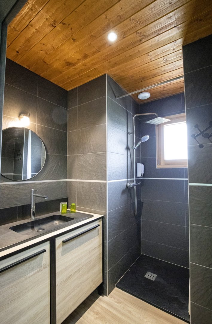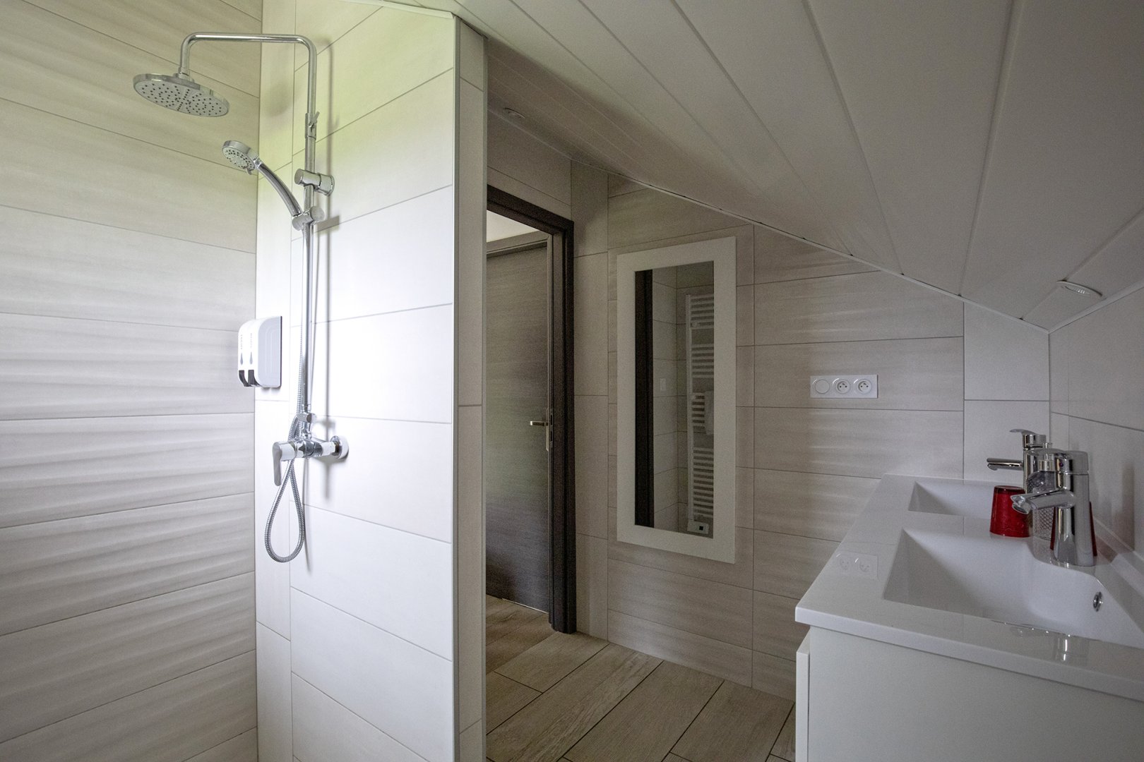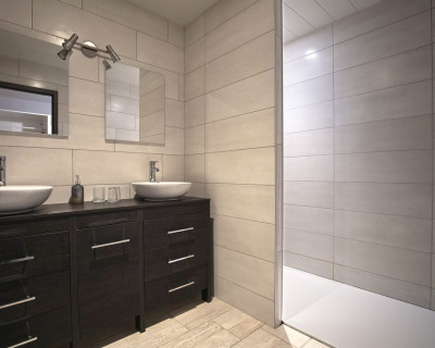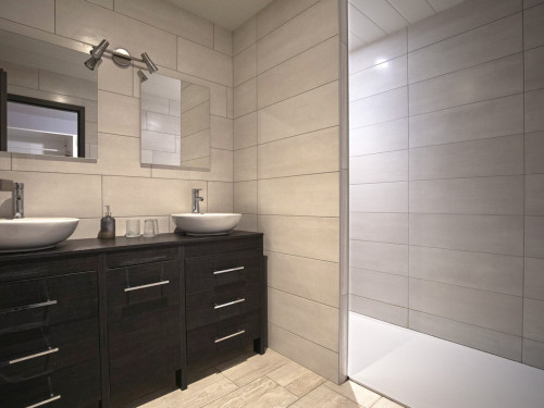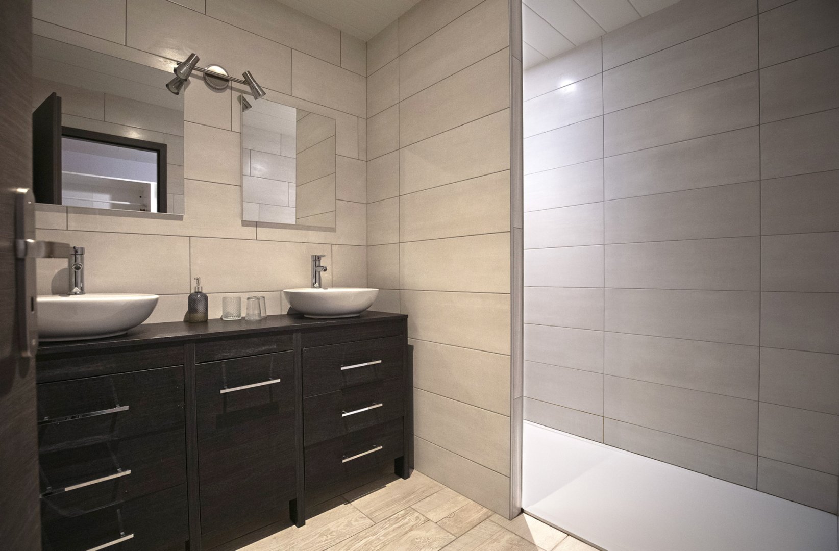 Salle d'eau privative avec douche à l'italienne, meuble double vasque, sèche serviettes électrique, sèche cheveux.