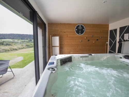 Cuisine, salon et pièce détente avec Spa en pièce commune.