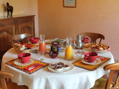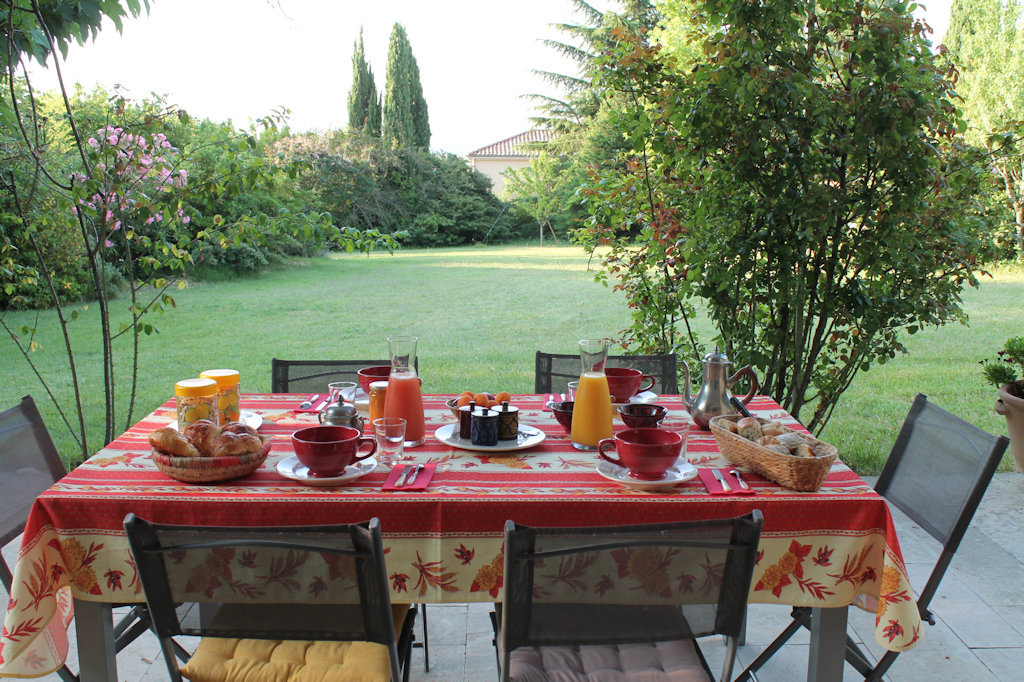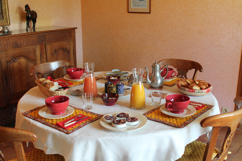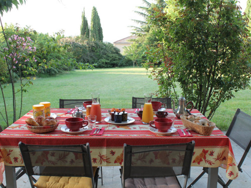 Un petit déjeuner gourmand composé de produits locaux et du jardin est servi sur la terrasse ou dans la salle à manger.