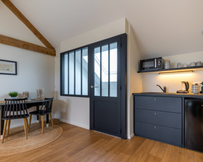 Ces 2 chambres sont reliées par un espace commun composé d'un salon et d'une kitchenette équipée d'un réfrigérateur, une bouilloire, une Nespresso et un micro-ondes.