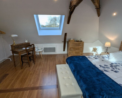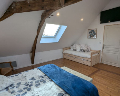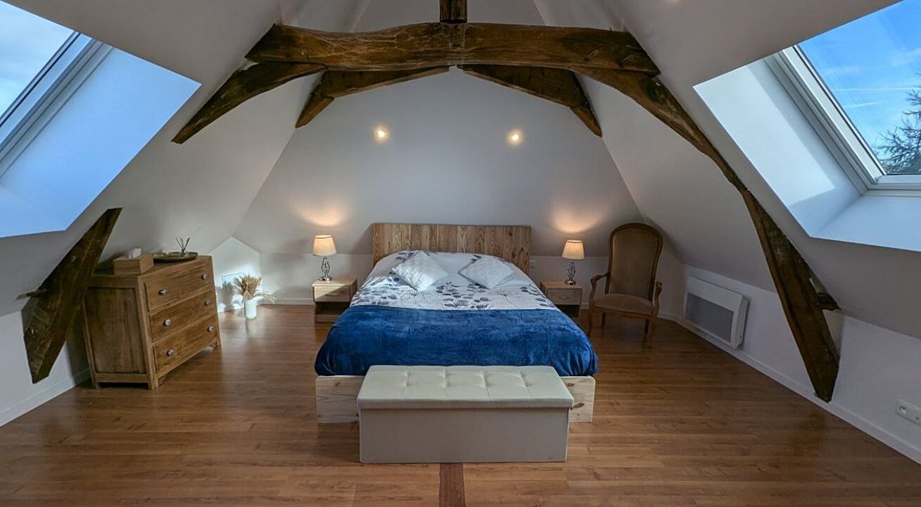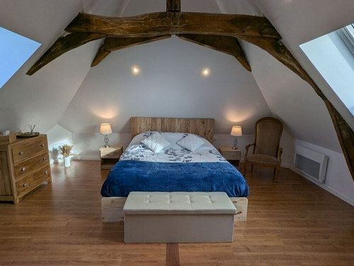 Nous vous proposons une suite familiale, sous son authentique charpente, à la décoration épurée et moderne.