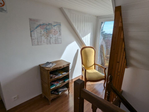 Il y a également, sur le palier, un coin détente avec fauteuil, prospectus des activités possible au cœur des Mauges, avec vue sur le jardin.