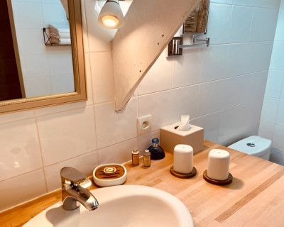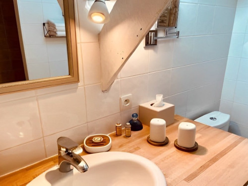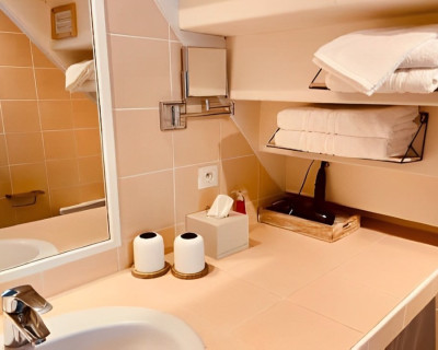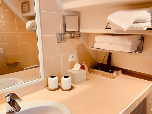 Une salle de bains avec toilette en suite, grande douche à l’italienne, sèche-cheveux et miroir de courtoisie.