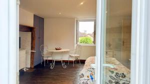 - une cuisine équipée d’un évier, d’une cuisinière, d’un réfrigérateur, d’une table et de chaises.