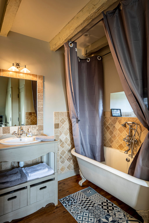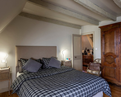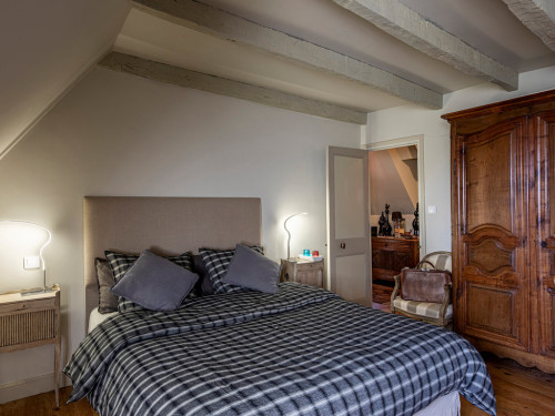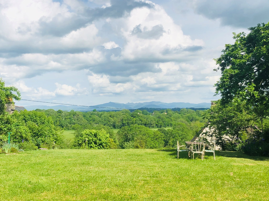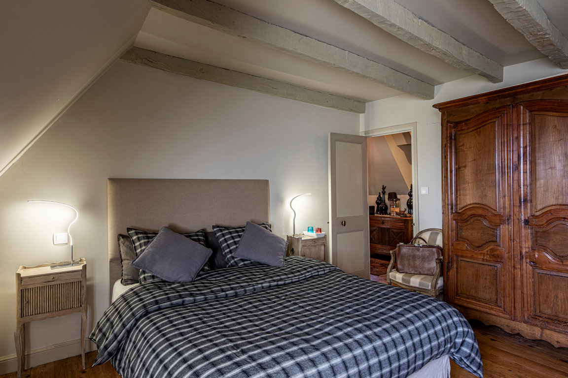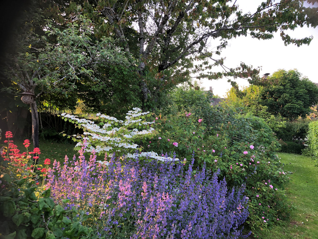 À l’étage : chambre avec vue sur le jardin, salle d’eau avec douche, lit 160x200 cm.