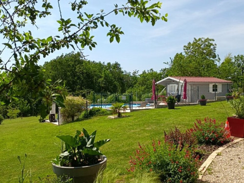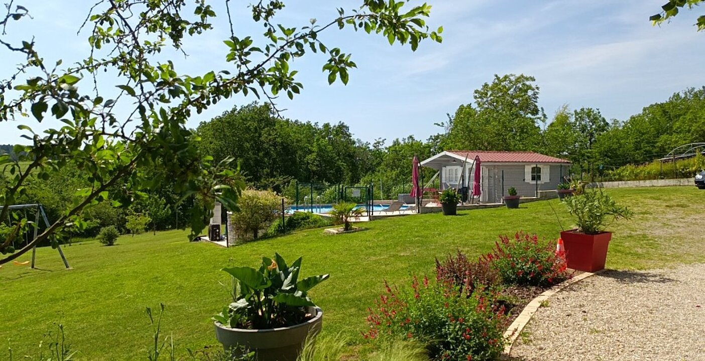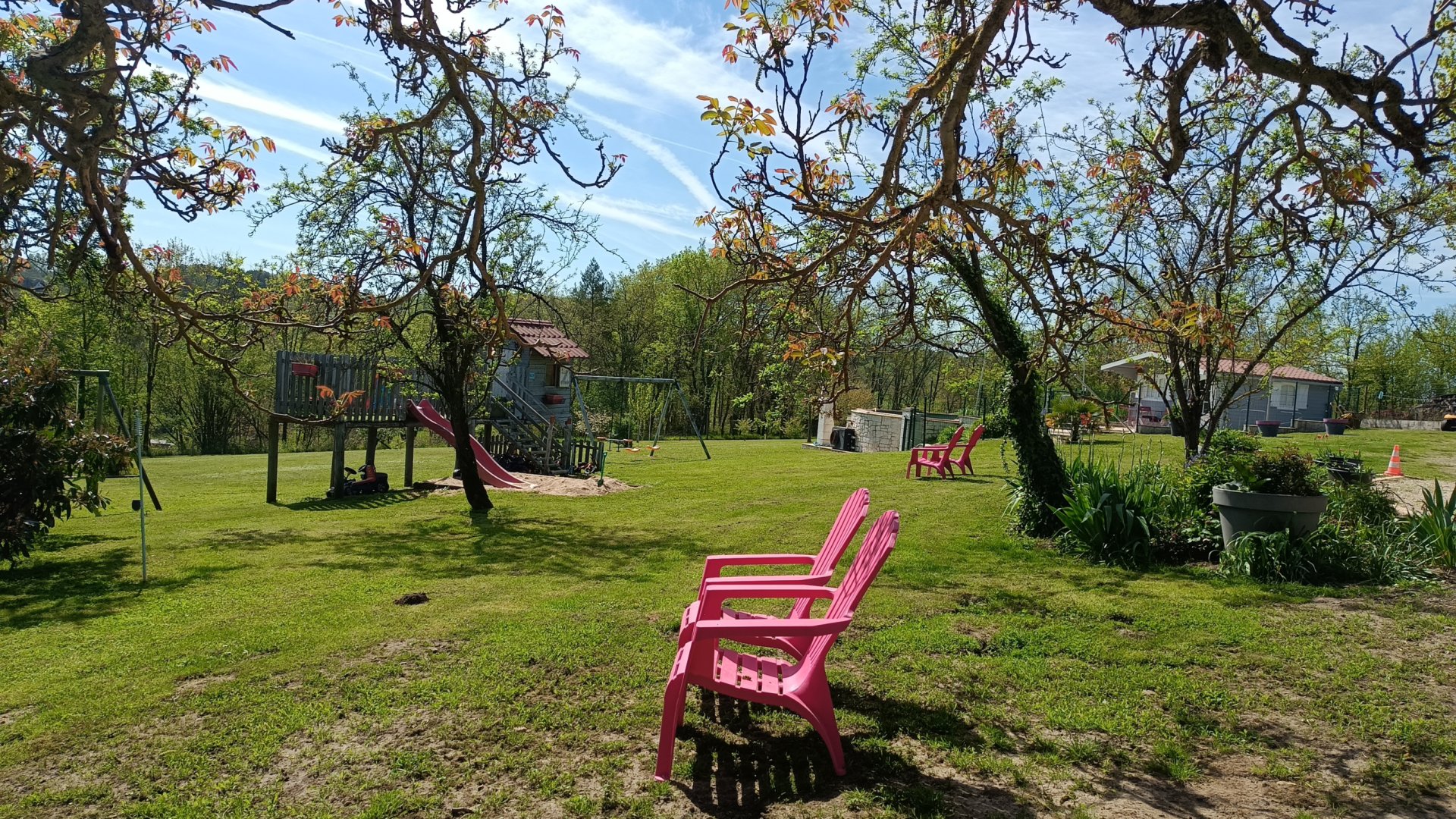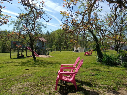 Jardin aménagé avec jeux pour enfants, piscine sécurisée aux beaux jours sous surveillance des parents, prêtée gracieusement.