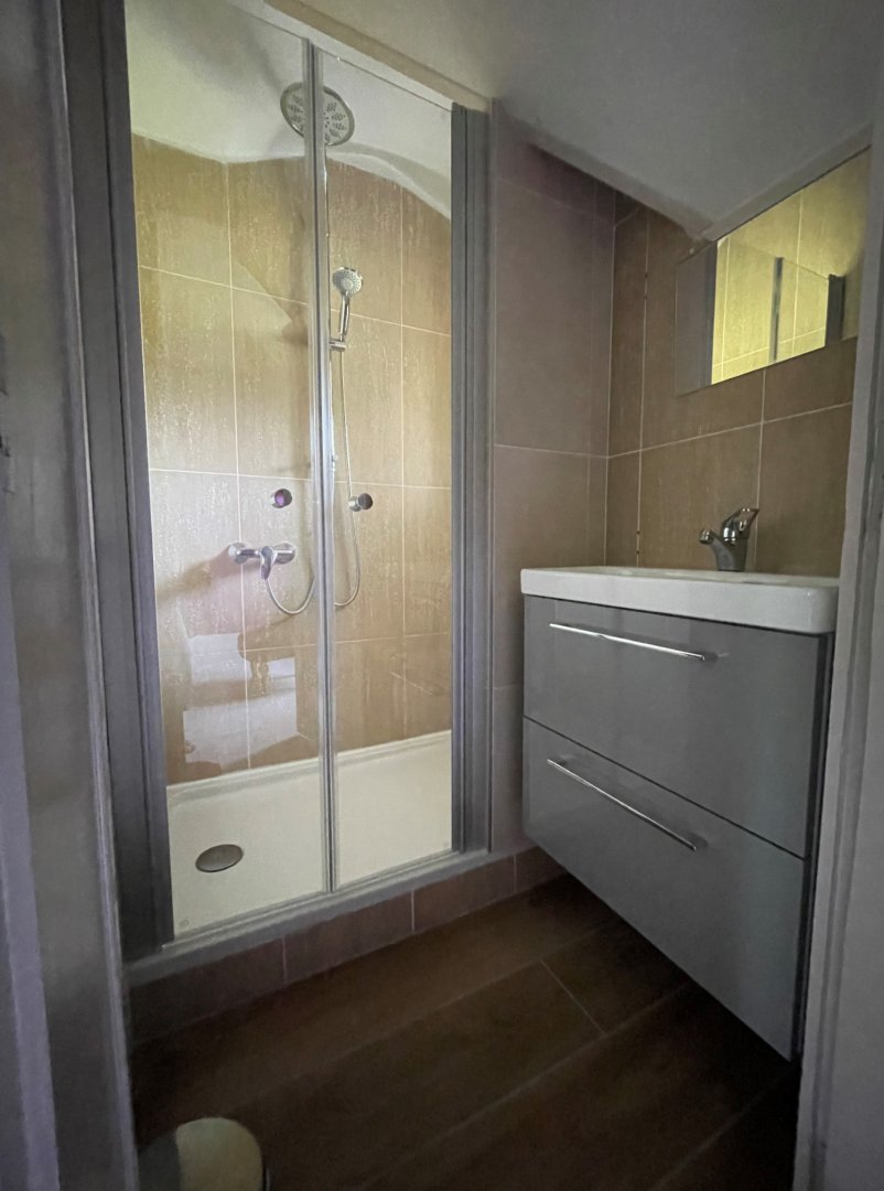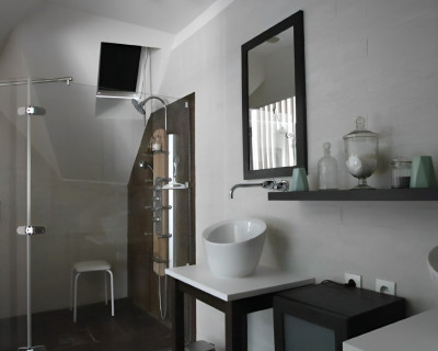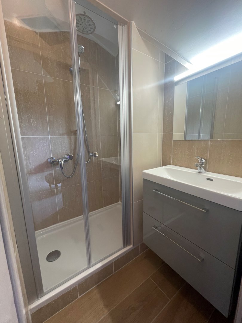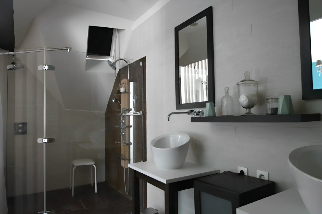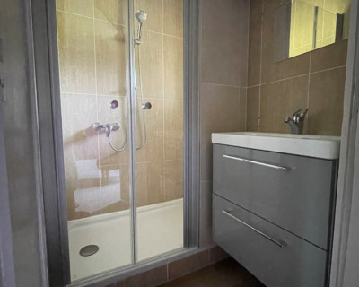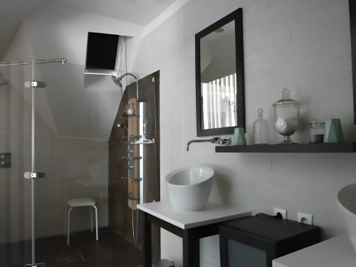 Les Anges (1 lit 160x200) ont une salle d'eau avec douche et lavabo, l'autre chambre (2 lits 80x200 superposés) a une salle de bain avec baignoire et lavabo.