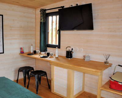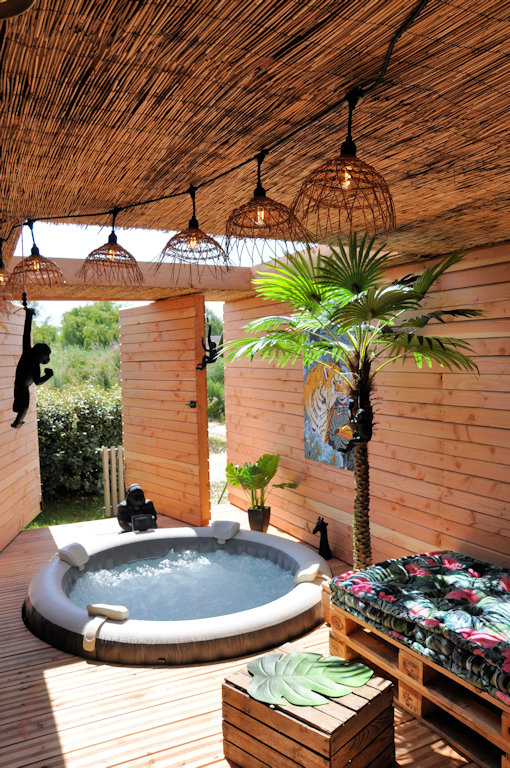 Vous pourrez bénéficier d'un espace détente privatif accessible depuis la terrasse de la cabane. Vous y trouverez un spa, un sauna, une douche ainsi qu'une banquette. Cet espace détente est optionnel et directement réservable soit au préalable soit lors de votre arrivée.