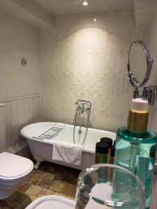 - une salle de bains avec baignoire, toilettes, sèche-cheveux, peignoirs et articles de toilette Rituals