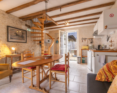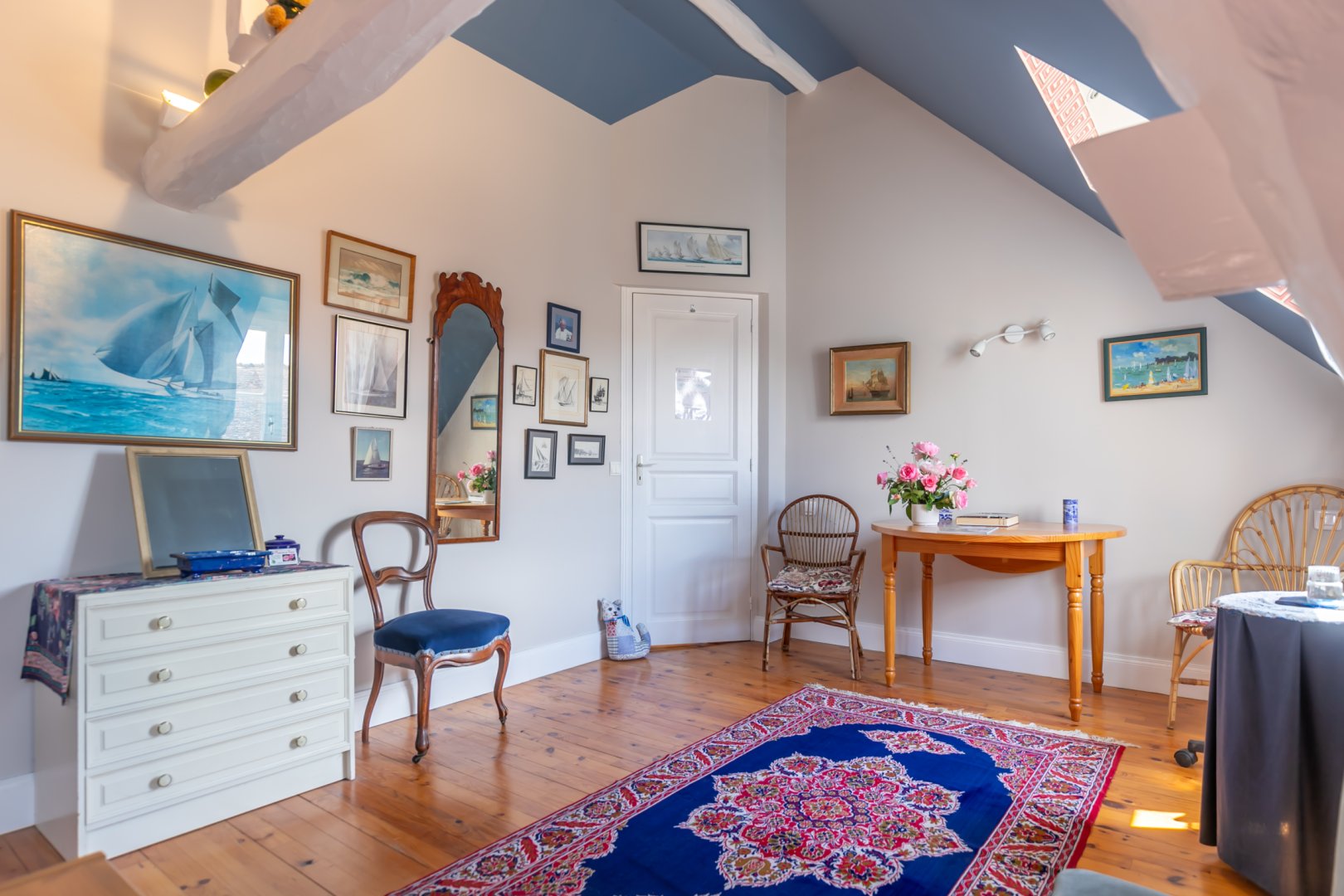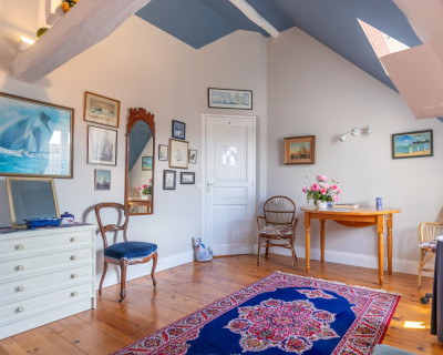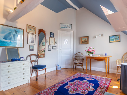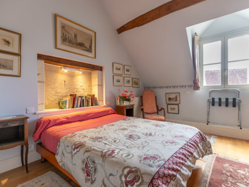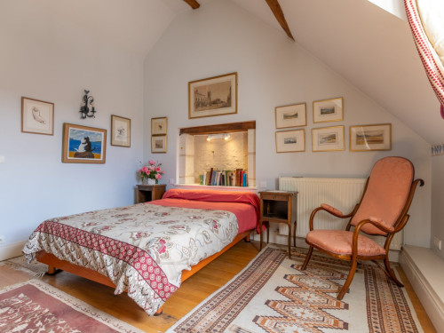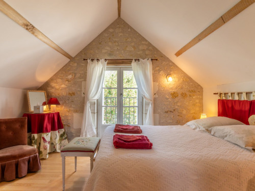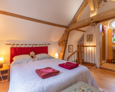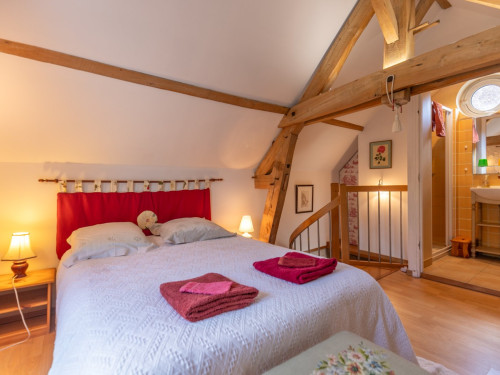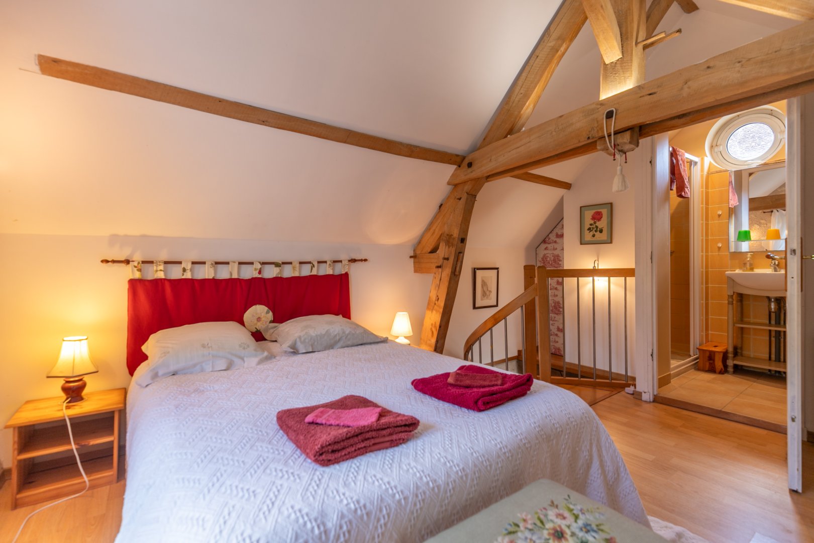La chambre est spacieuse et lumineuse, avec poutres apparentes, ou un ou deux lits d'appoint peuvent être facilement ajoutés, a recevoir 2 à 4 personnes.
