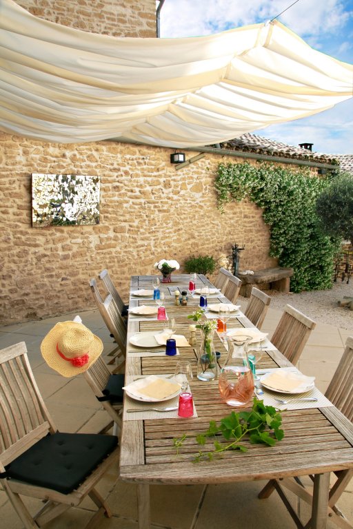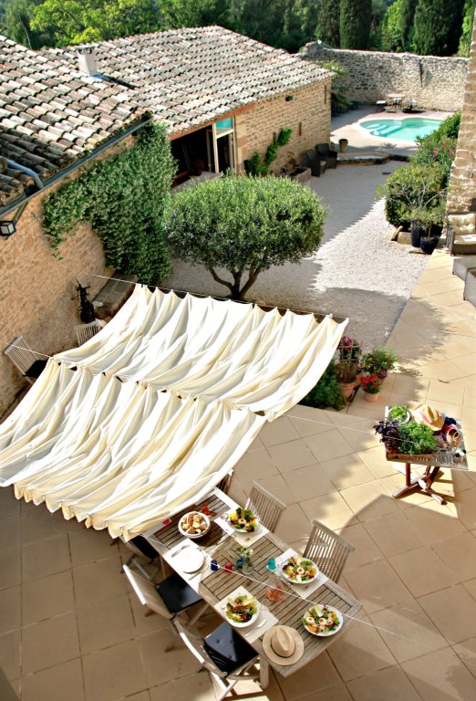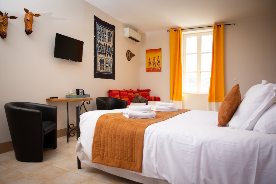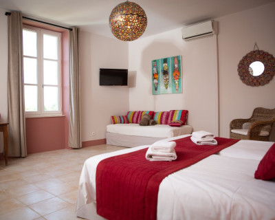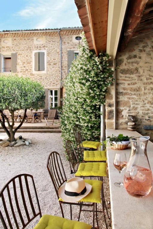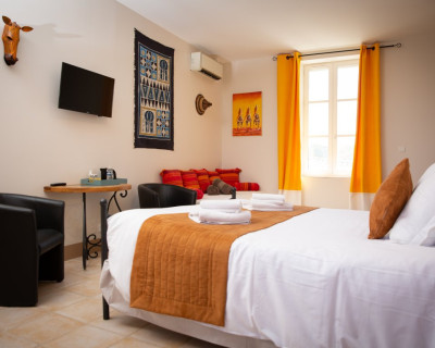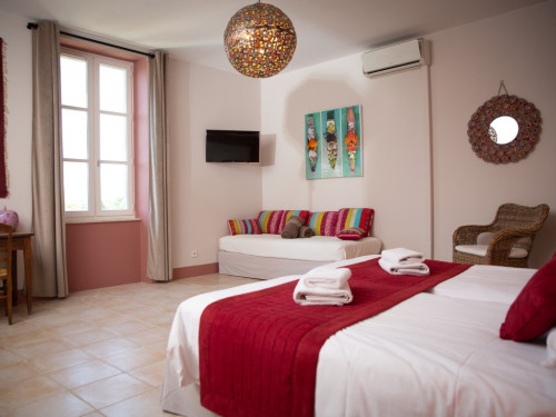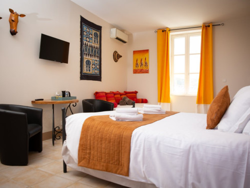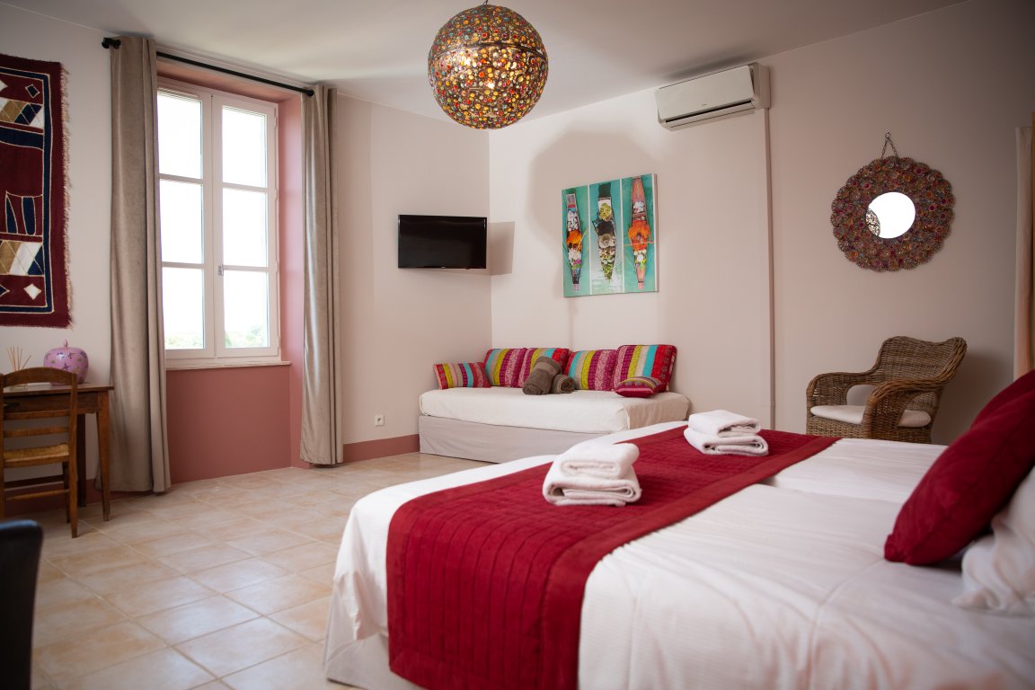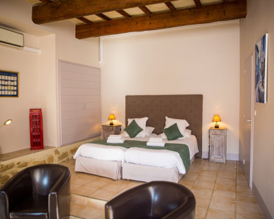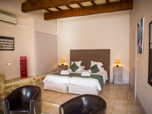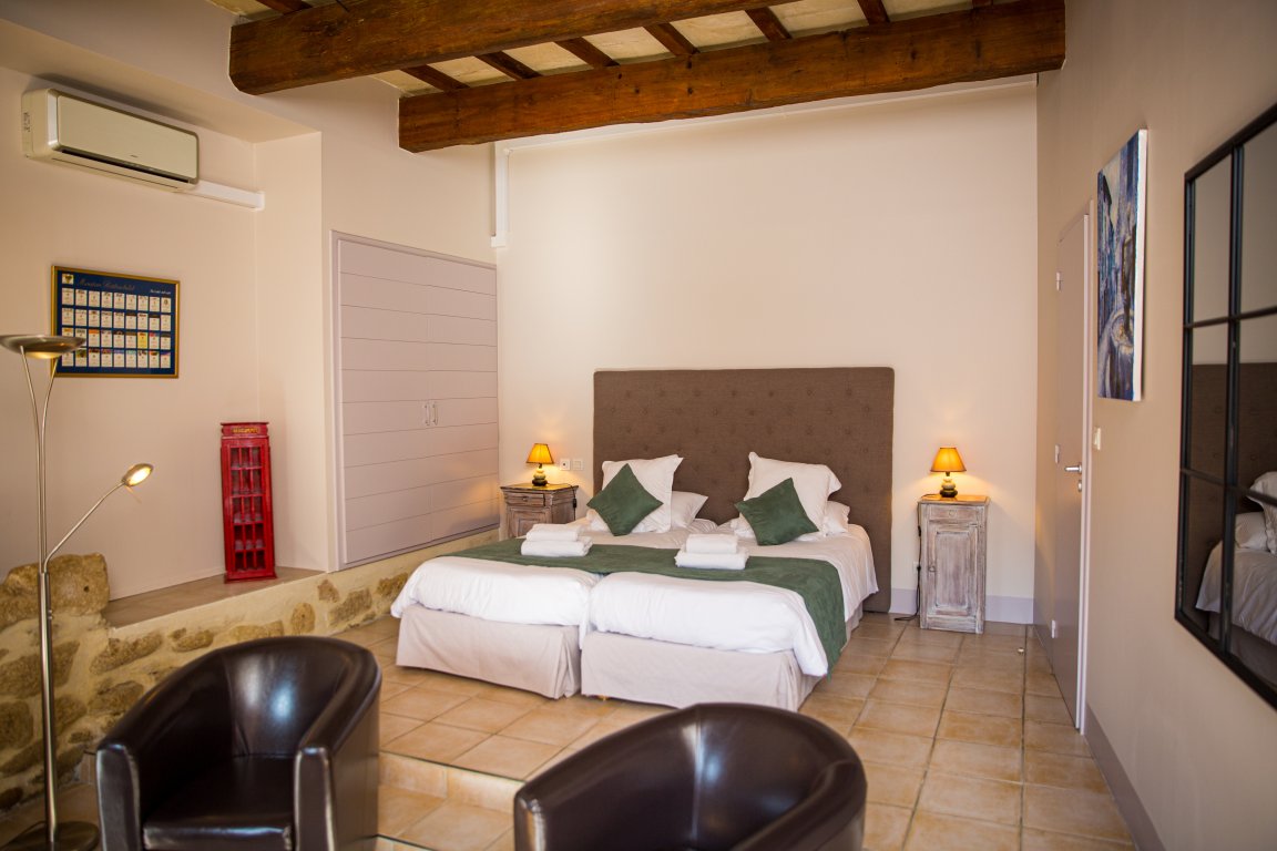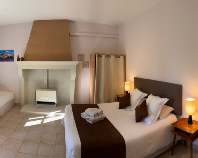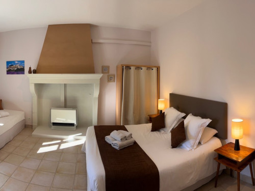 Baignoire, douche, WC privé séparé, sèche-cheveux, coin salon, télévision, prises USB, cette chambre possède une cheminée en pierre ancienne et des voûtes qui vous rappelleront le prestige de cette bastide Drômoise du 17°siècle située à seulement 5 minutes de Grignan en Drôme provençale.