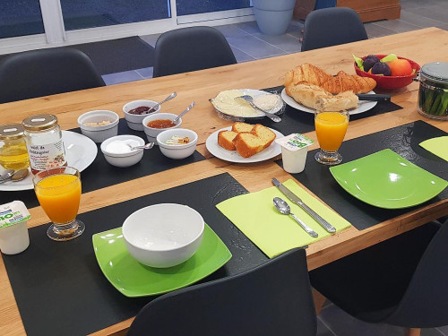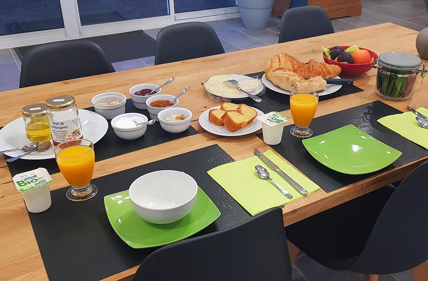 Le petit déjeuner (servi en chambre en cas de mauvais temps) : boisson chaude au choix, yaourt, fruits frais, pain, jus d'orange, miel local, confiture, viennoiserie, fromage et jambon
