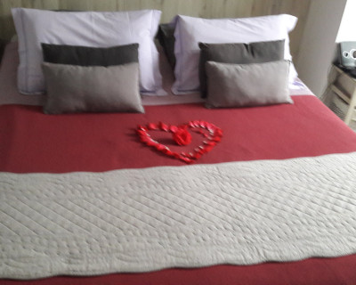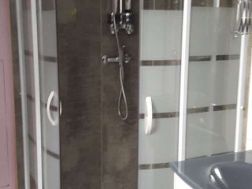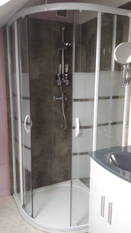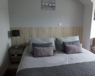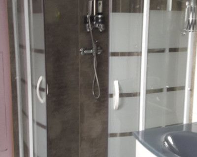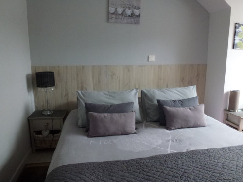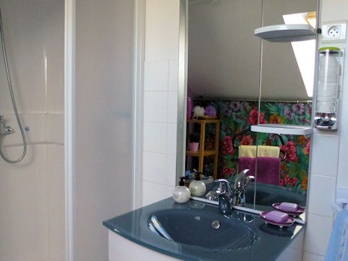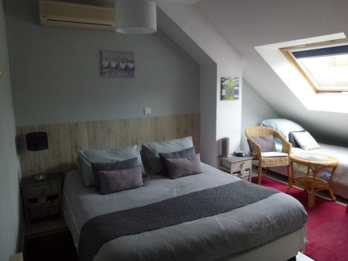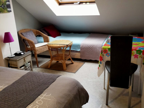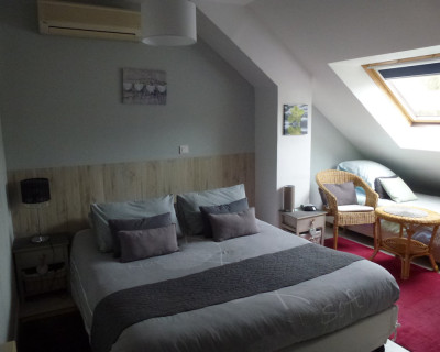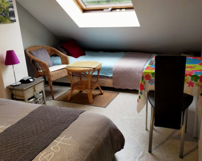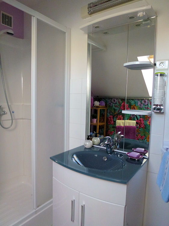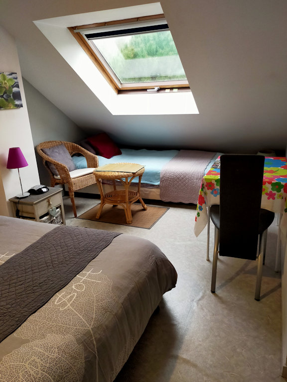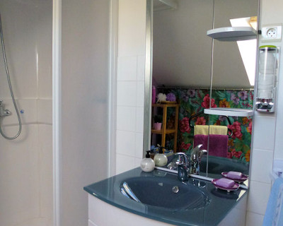 À l'étage : 1 chambre (18 m²) avec 1 lit double de 160 cm x 200 et 1 lit 1 pers. de 90 cm x 200, climatisation, chauffage, wifi, sèche-cheveux, peignoirs, articles de toilette, bouilloire, cafetière, réfrigérateur, four à micro-ondes, vue sur le jardin fleuri et arboré, salle de bain privative (douche), en rez-de-chaussee (6 m²) : WC séparé (rez-de-chaussée, escalier).