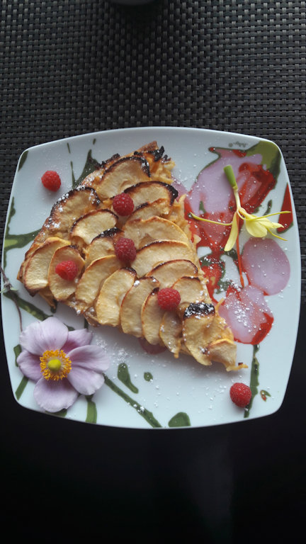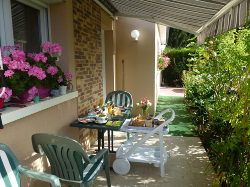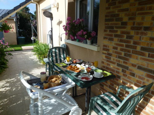 Petit déjeuner servi en terrasse selon météo (confitures, gâteaux maison).