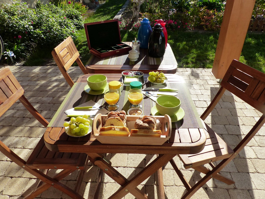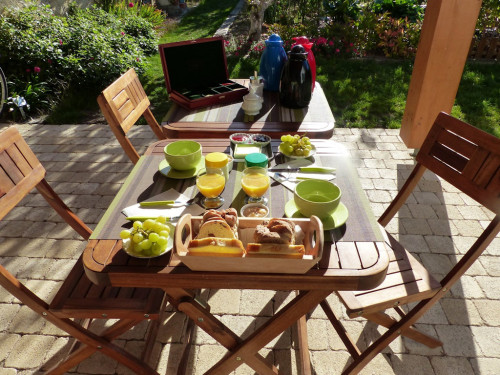 Une terrasse couverte vous permettra aux beaux jours d’y prendre le petit déjeuner « maison » et de profiter du jardin.