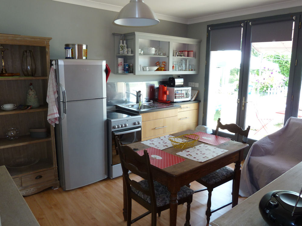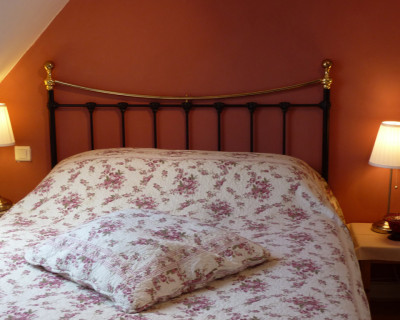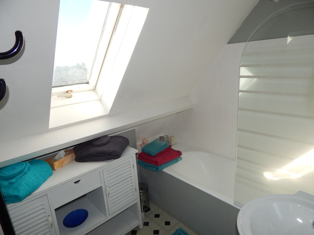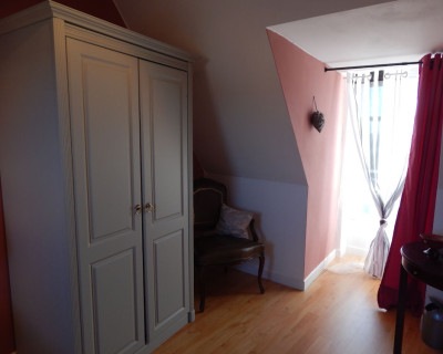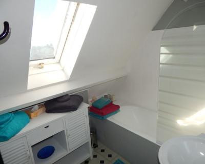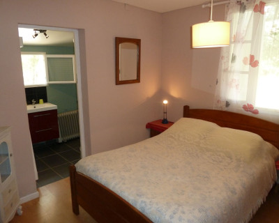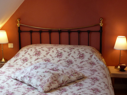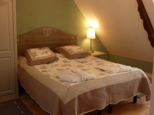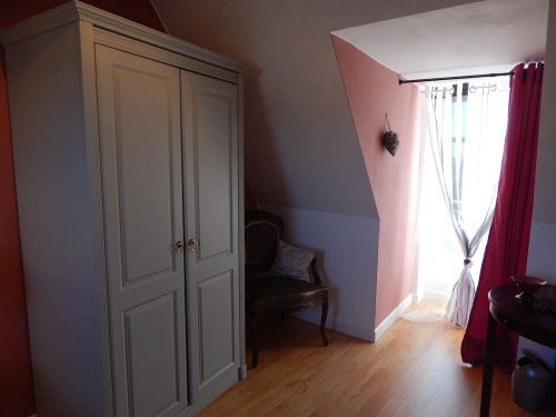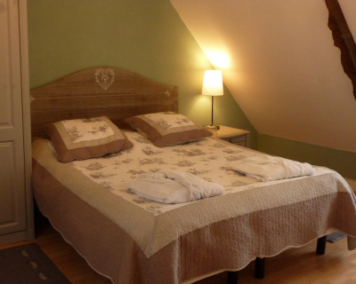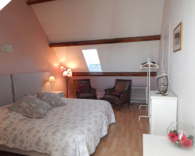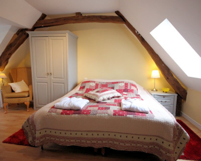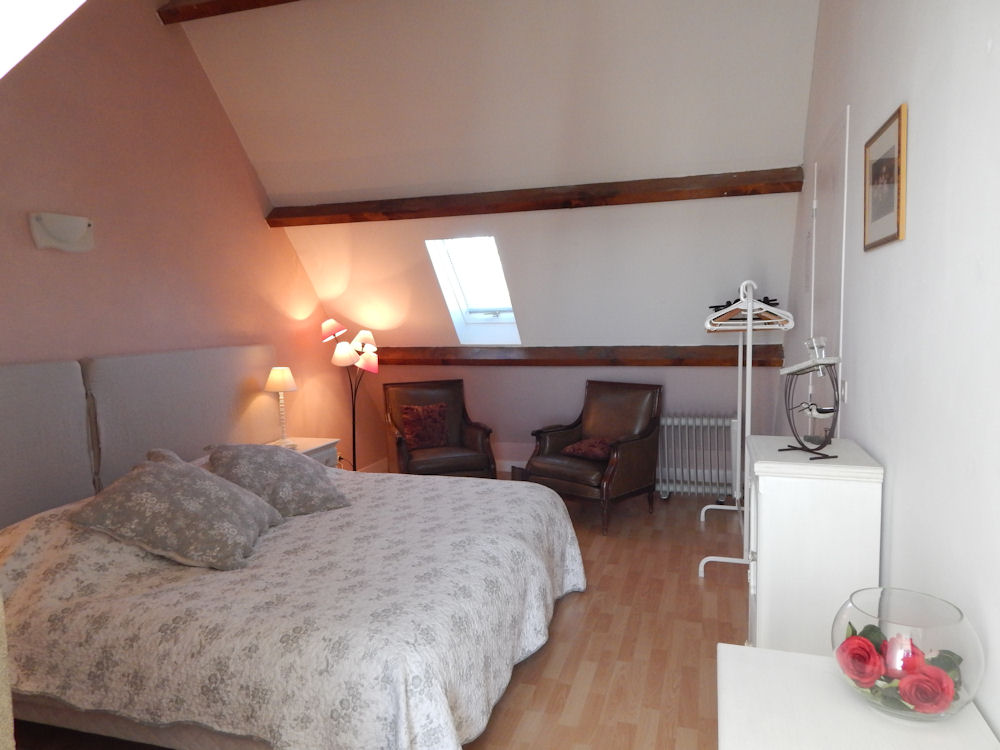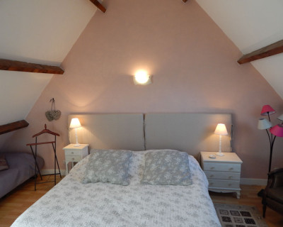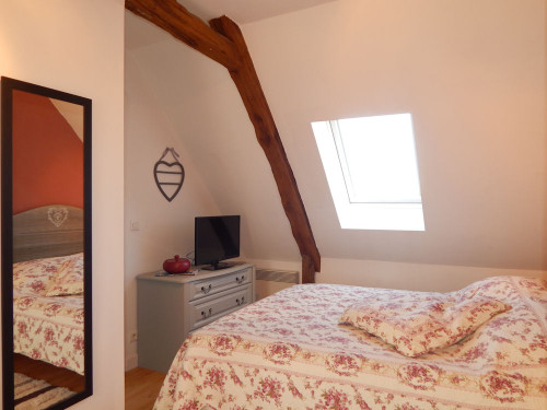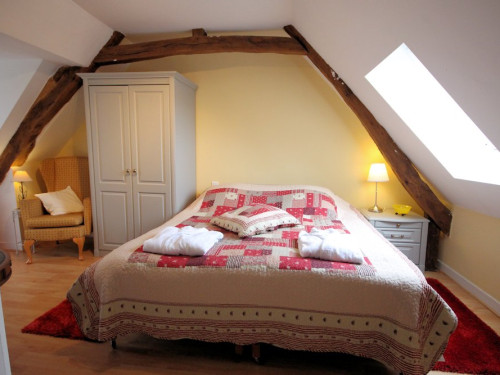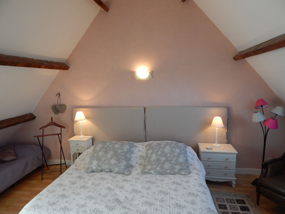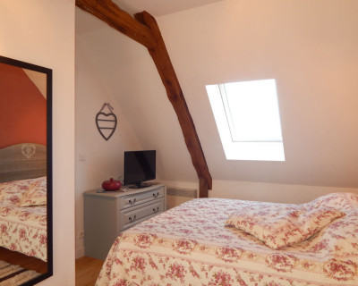Une grande fenêtre avec vue sur le jardin et un vélux illuminent la chambre.