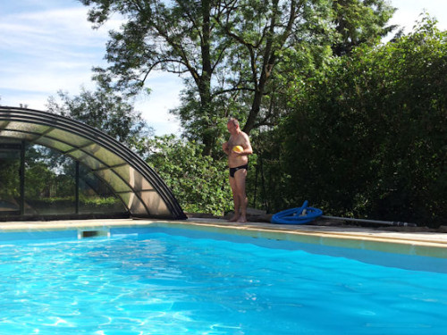 Le cadre est sympathique et boisé et la piscine très agréable, bien que rudimentaire (petite , peu profonde) et pas très bien nettoyée (on peut compter les cadavres d’insectes flotter). Le jardin autour manque de transats ou chaises longues, l’herbe (très) sèche avec aiguilles et pommes de pin n’est pas le meilleur sol pour y poser sa serviette. Le gîte se trouve en bordure de route départementale (pas facile à trouver avec un si petit panneau, merci le GPS), on entend les voitures passer lorsqu’on fait bronzette. C’est dommage, on regretterait presque le rire des mouettes.
