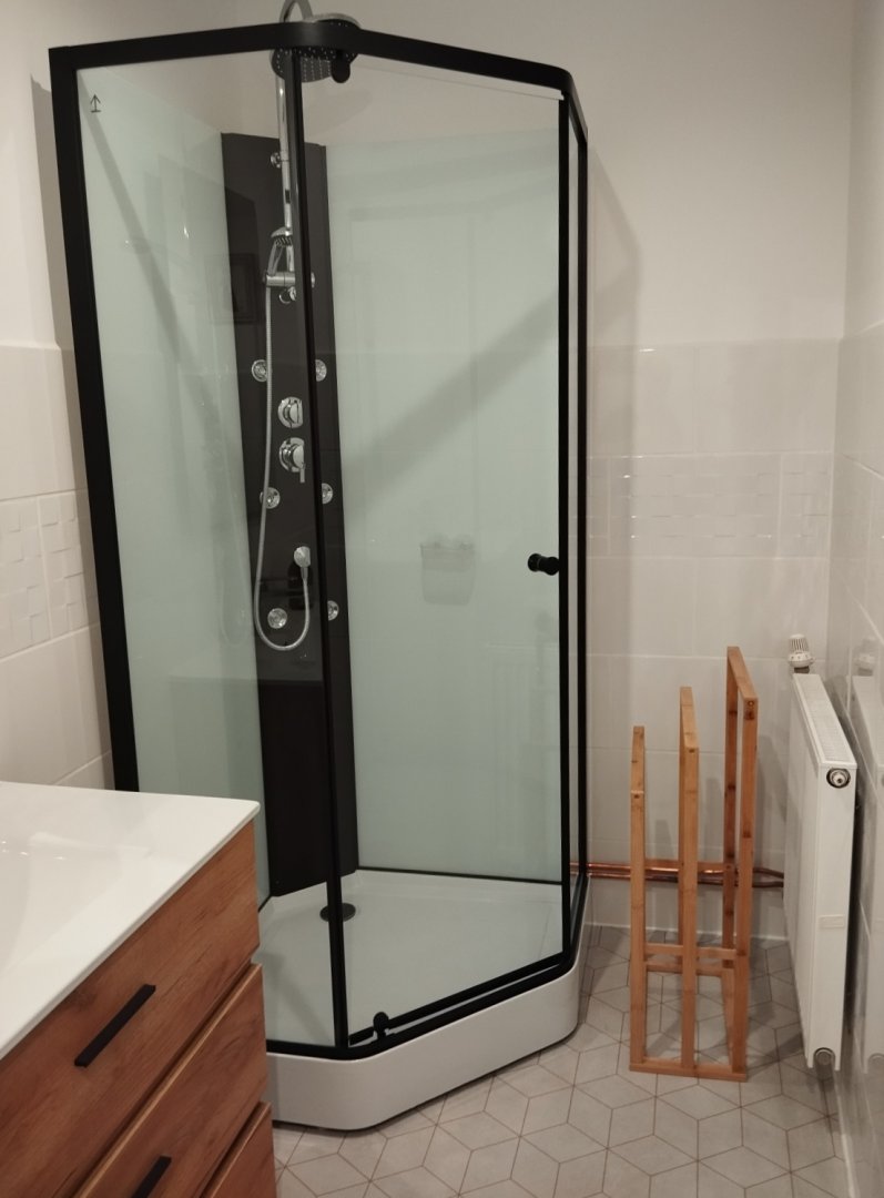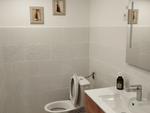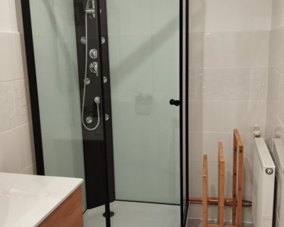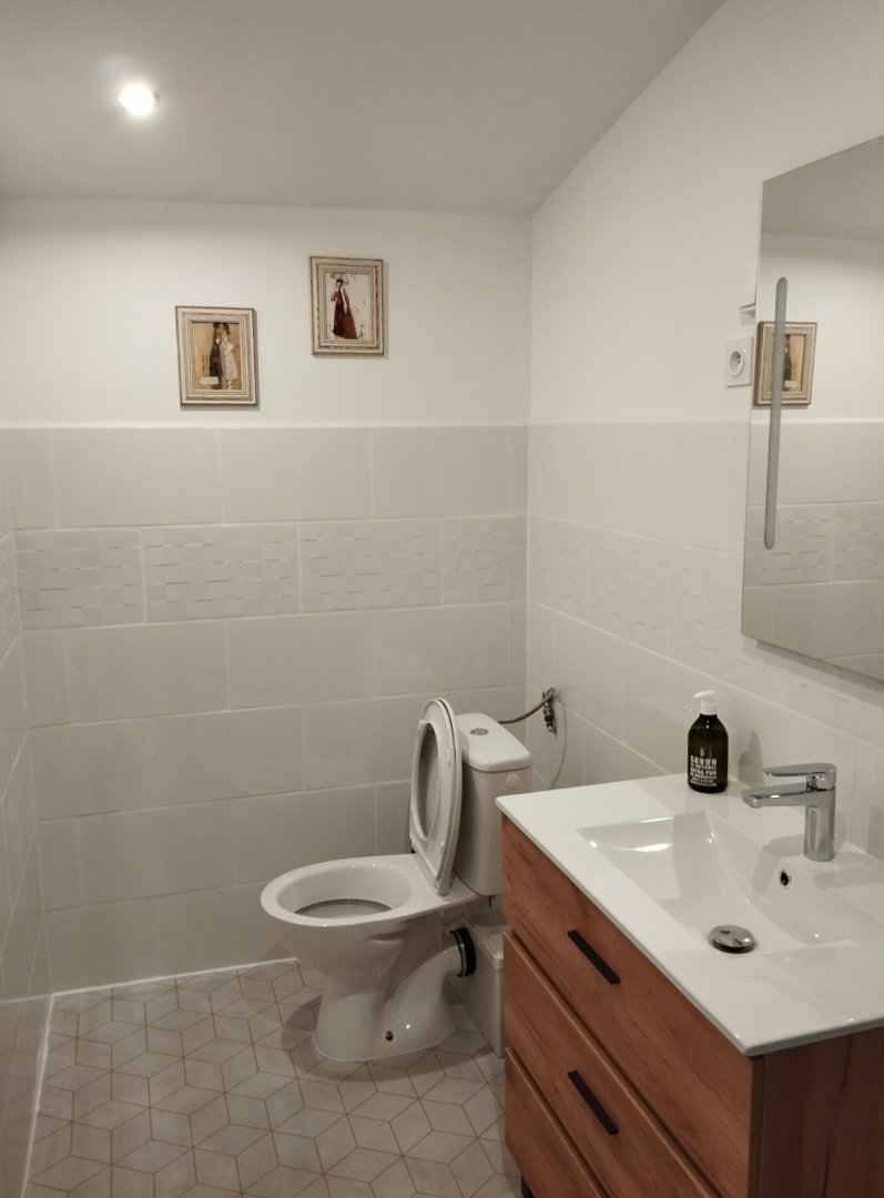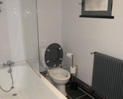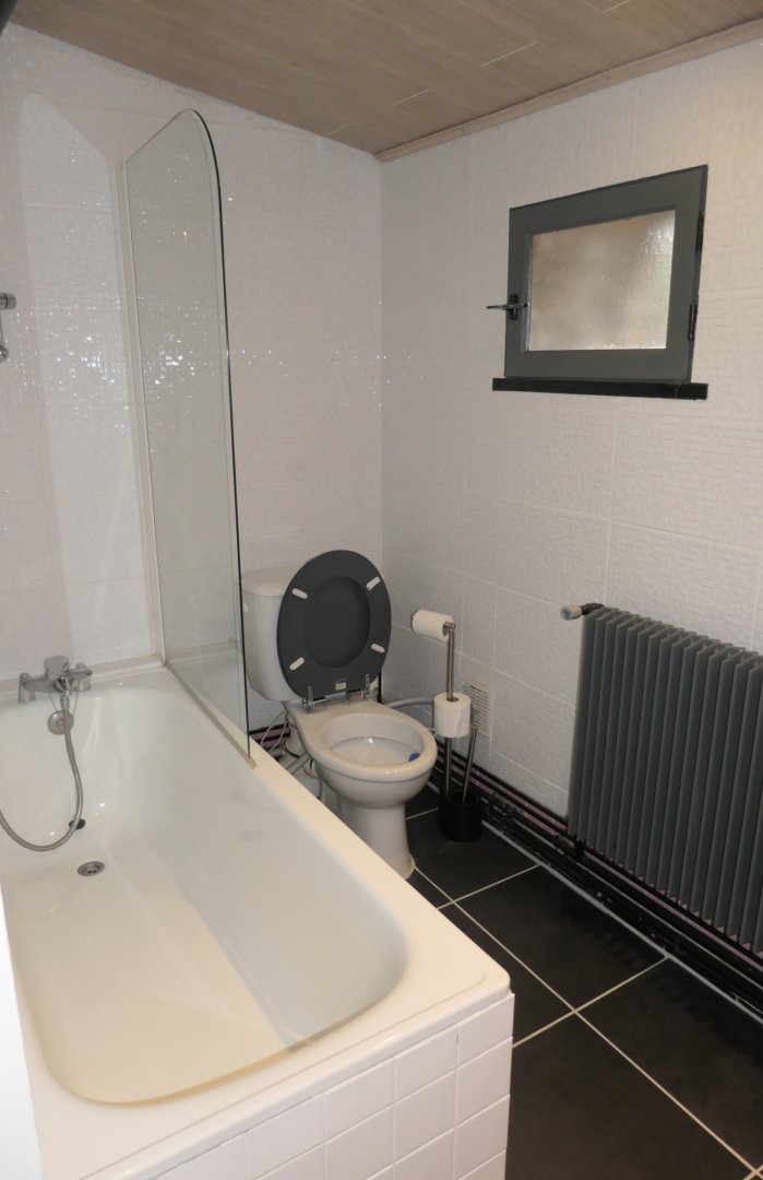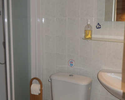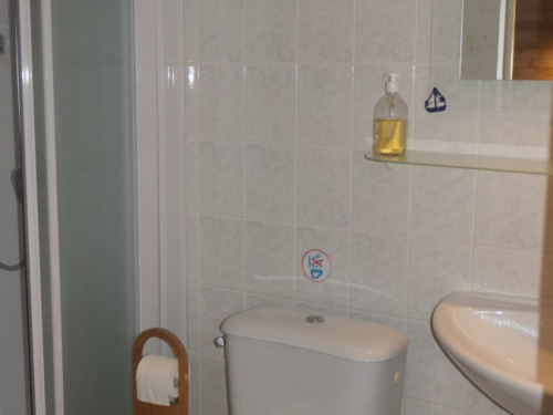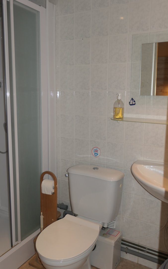 La salle de bain est située dans la chambre et comprend une douche, lavabo et un WC.