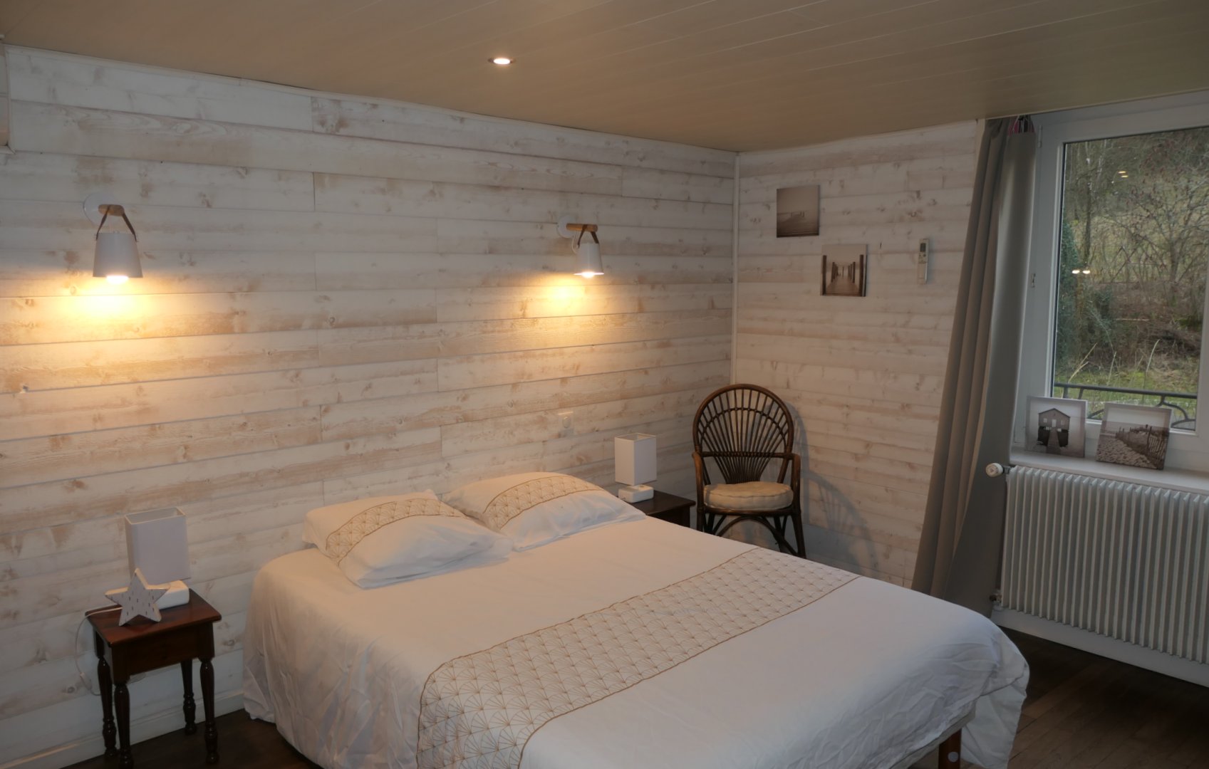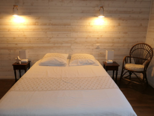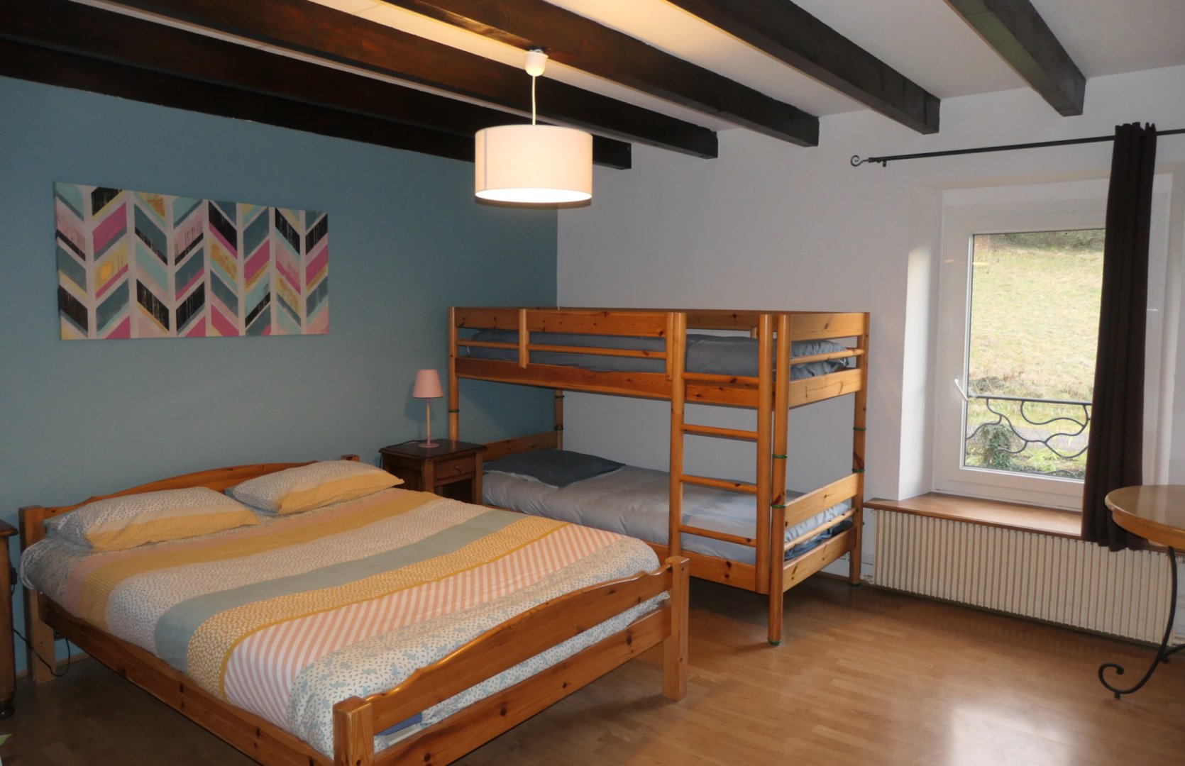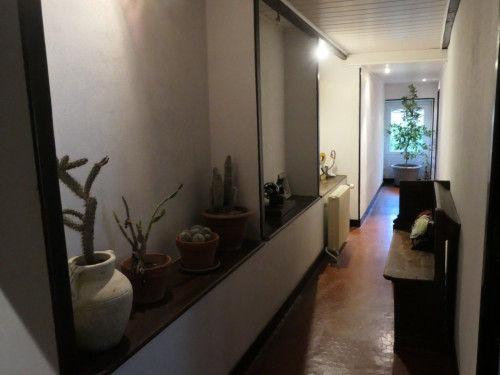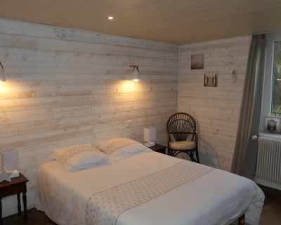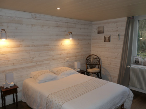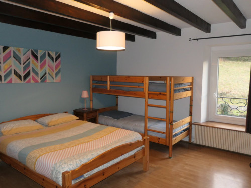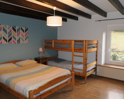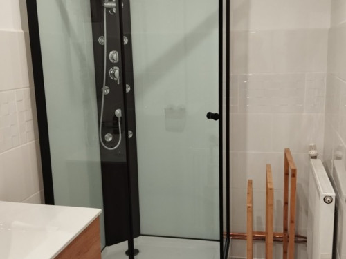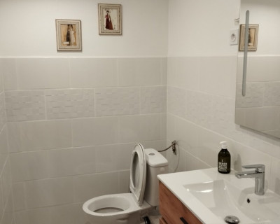 La salle de bain est située dans la chambre et comprend une douche, lavabo et un WC.