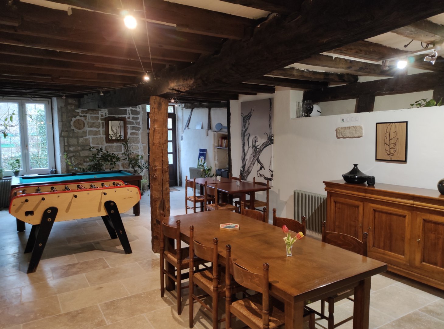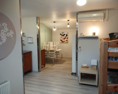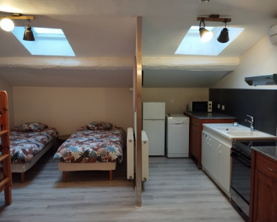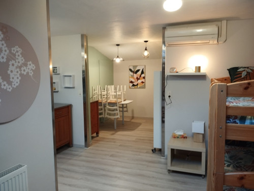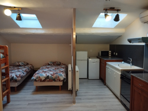 Il y a un coin cuisine tout équipé et un coin repas.