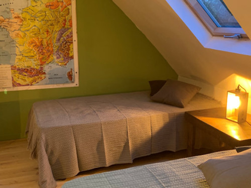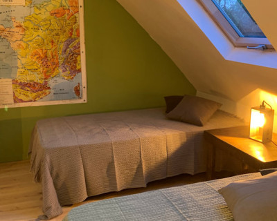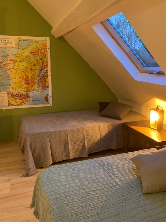 Joli duplex, formé de deux chambres, l'une avec 1 grand lit et 1 lit simple, accès a l'autre chambre par un escalier avec 3 lits simples, le tout avec une salle de bain douche italienne et WC privé, peut convenir à un couple, une famille, des travailleurs, deux couples, au total 6 couchages.
