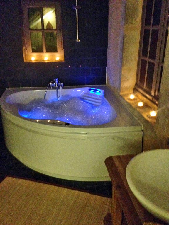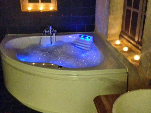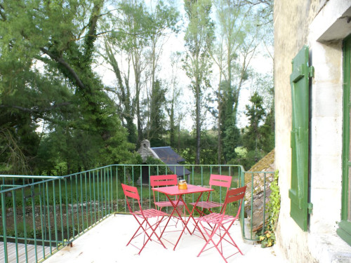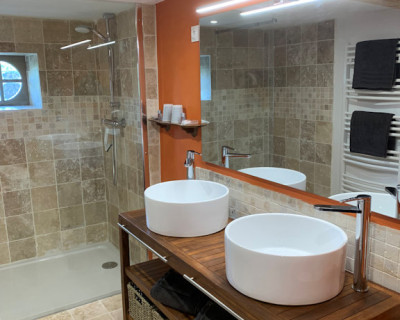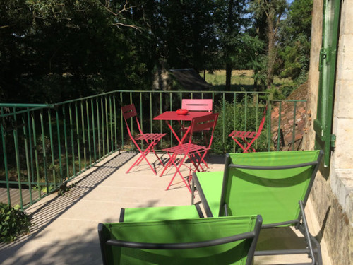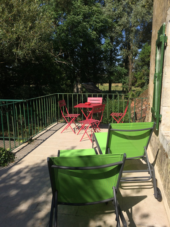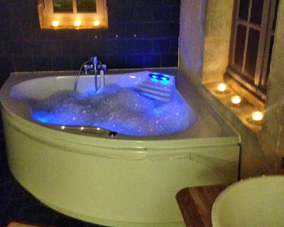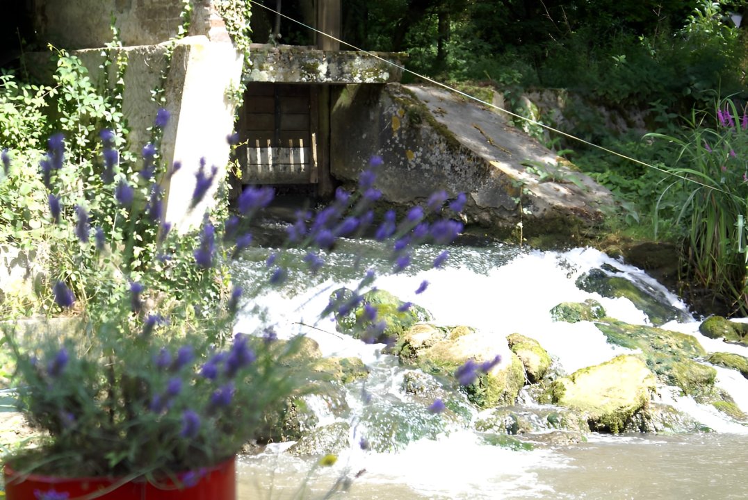 La Meunière -balnéo se situe au premier étage avec une salle de bain baignoire balnéothérapie .Elle est en connexion avec une grande pièce à vivre commune, avec télévision, coin bureau et coin salon qui surplombe la rivière ainsi que la roue à aube.
