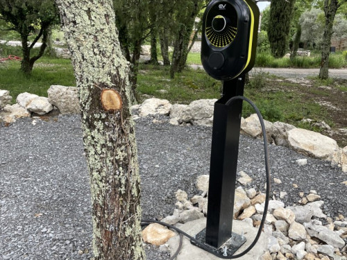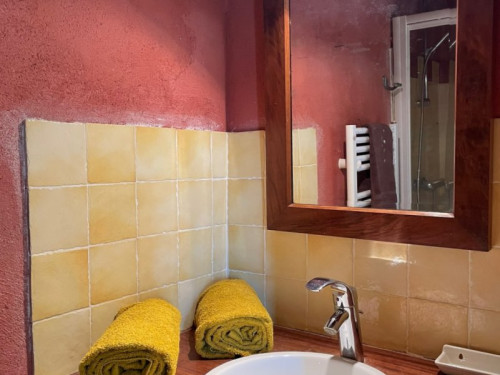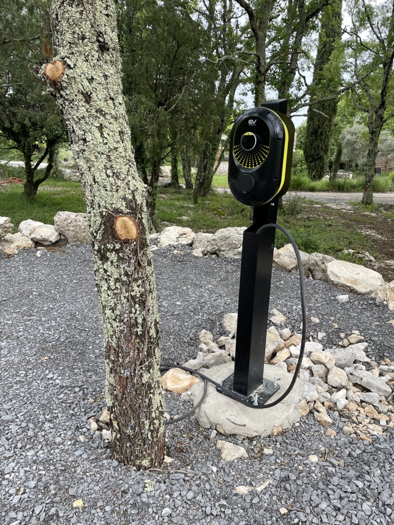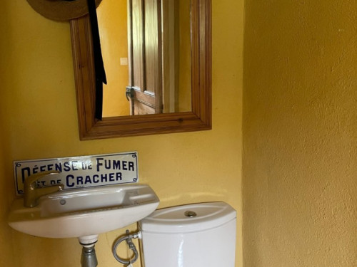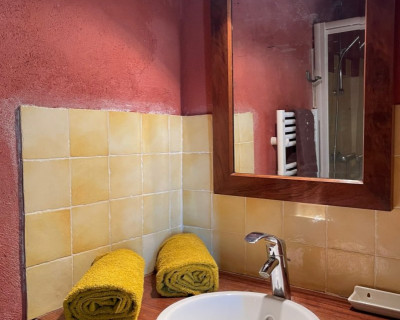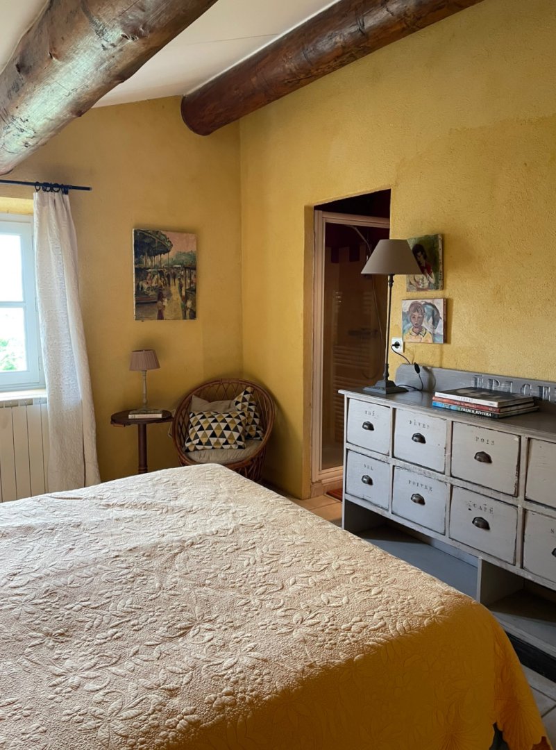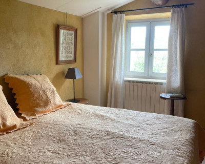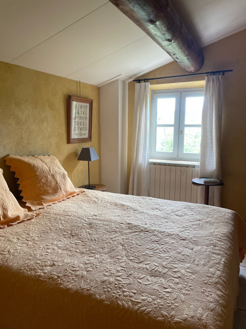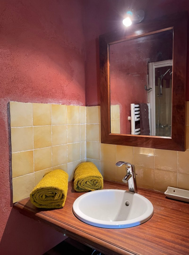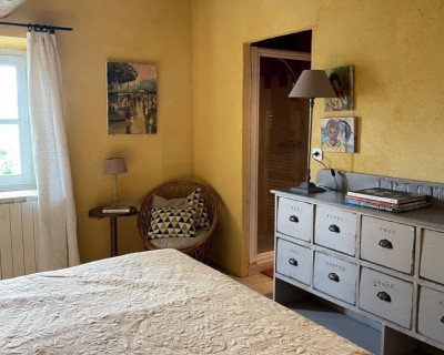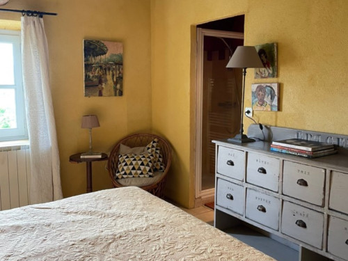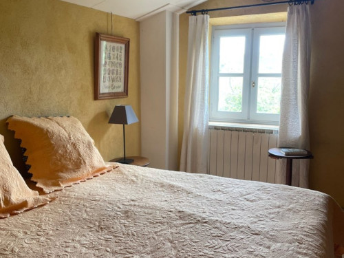 Elle possède un lit en 160 cms , un petit frigo, un peu de vaisselle, une bouilloire et une cafetière