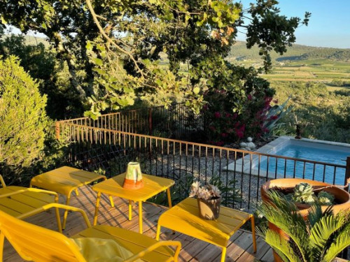 La piscine réservée au petit mas a une vue panoramique sur le vignoble de Sauveplantade