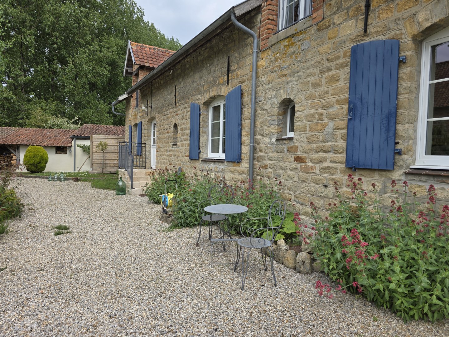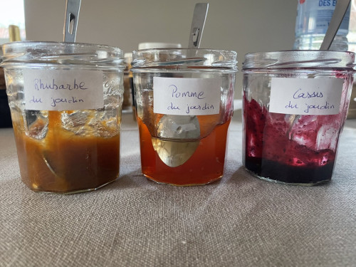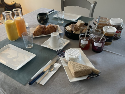 Le petit déjeuner est servi au rez-de-chaussée de la maison ou, si le temps le permet, sur la terrasse. Nous vous proposons un petit déjeuner avec café, thé, chocolat, lait, jus d’orange, jus de pomme fabriqué sur place, pain, croissant, yaourt, confiture maison, œufs de nos poules...