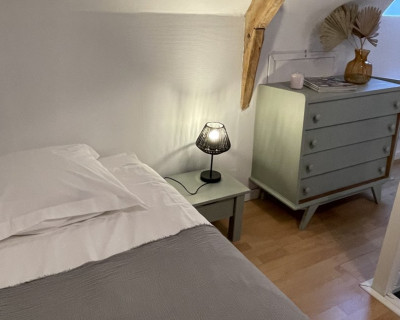 La chambre est composée d'un espace avec lit en 160 et télévision, d'un espace salon, une salle de bain et un WC séparé.