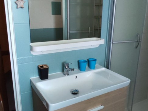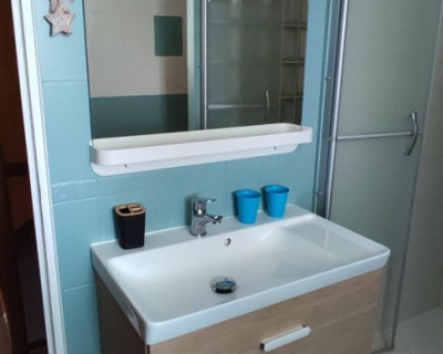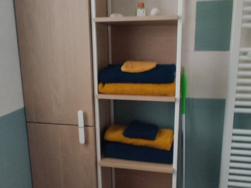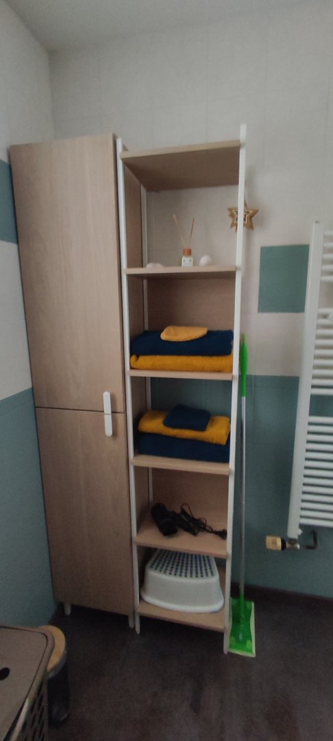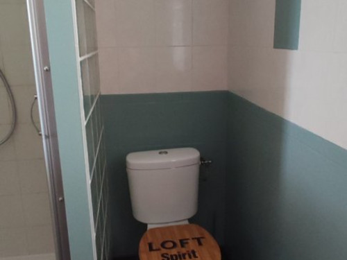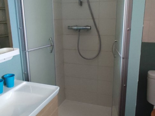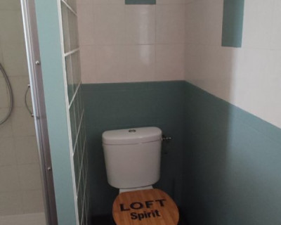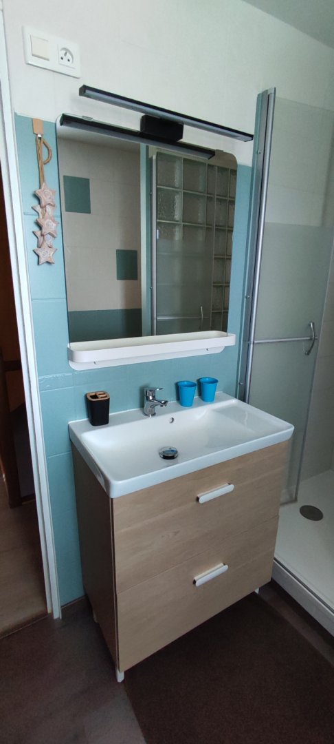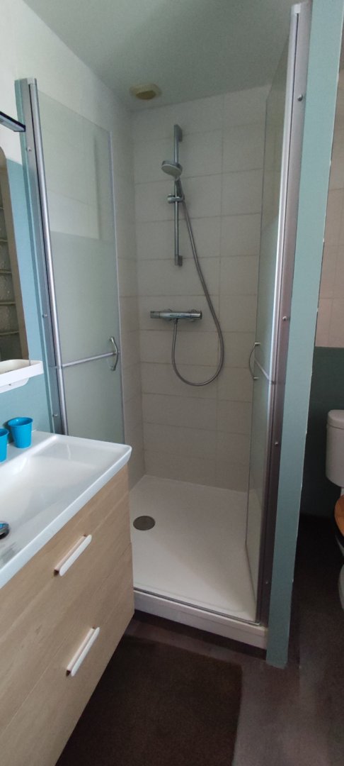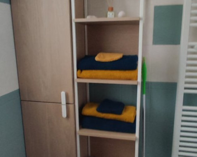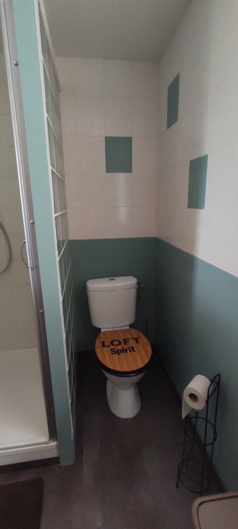 - 1 salle d'eau avec toilettes. Linge de toilettes, rangement, miroir, sèche cheveux, sèche serviette.