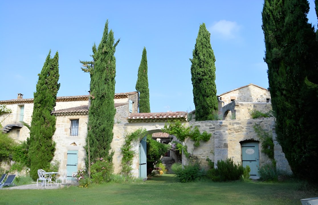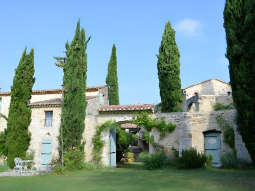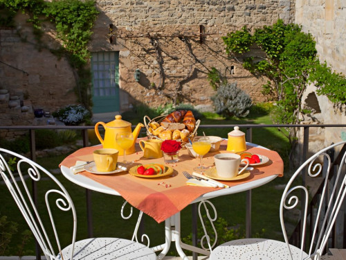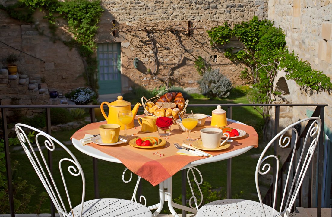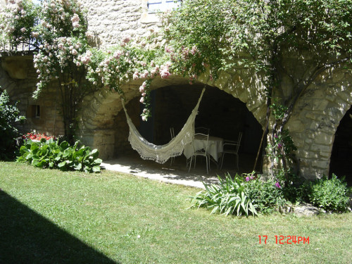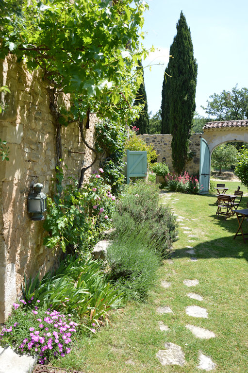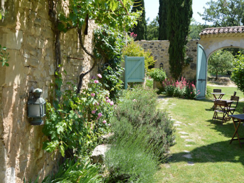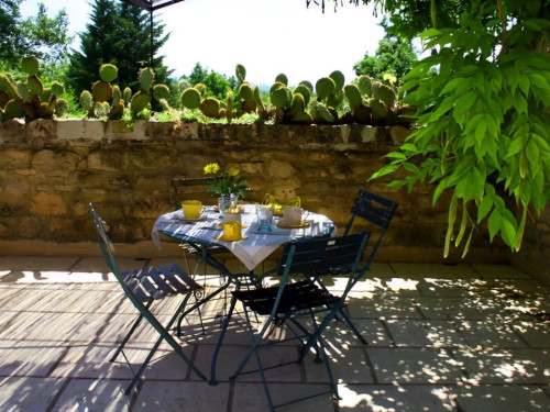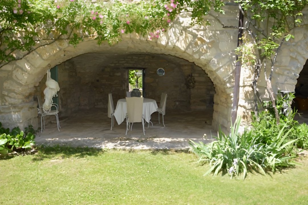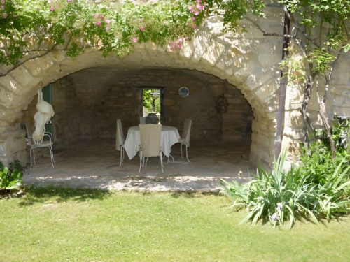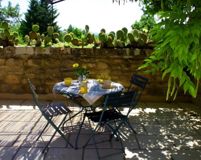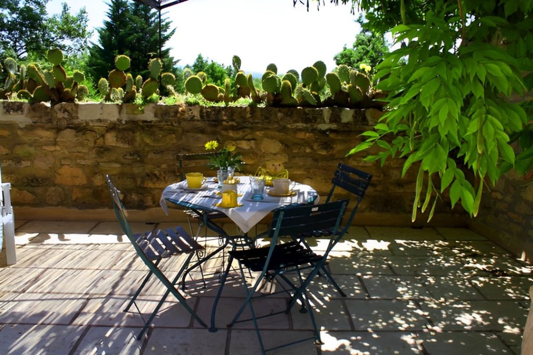 Petite terrasse entourée des rosiers avec table et chaises donnant sur cour intérieure fleurie.