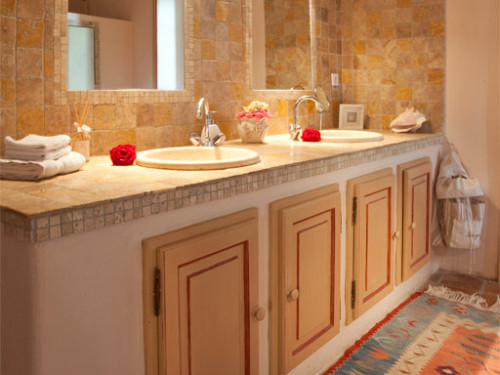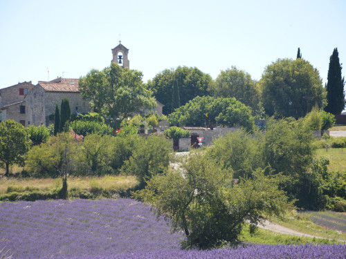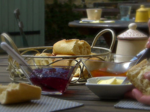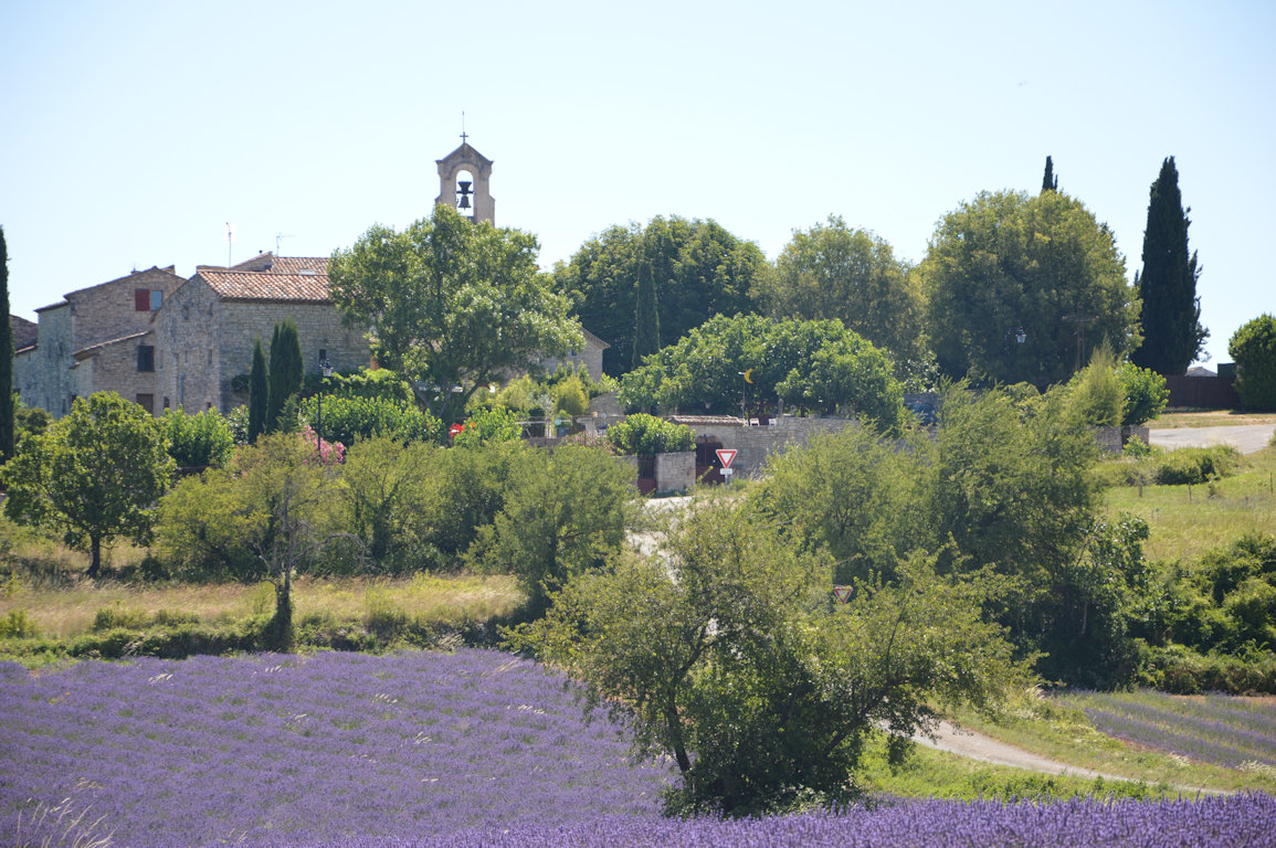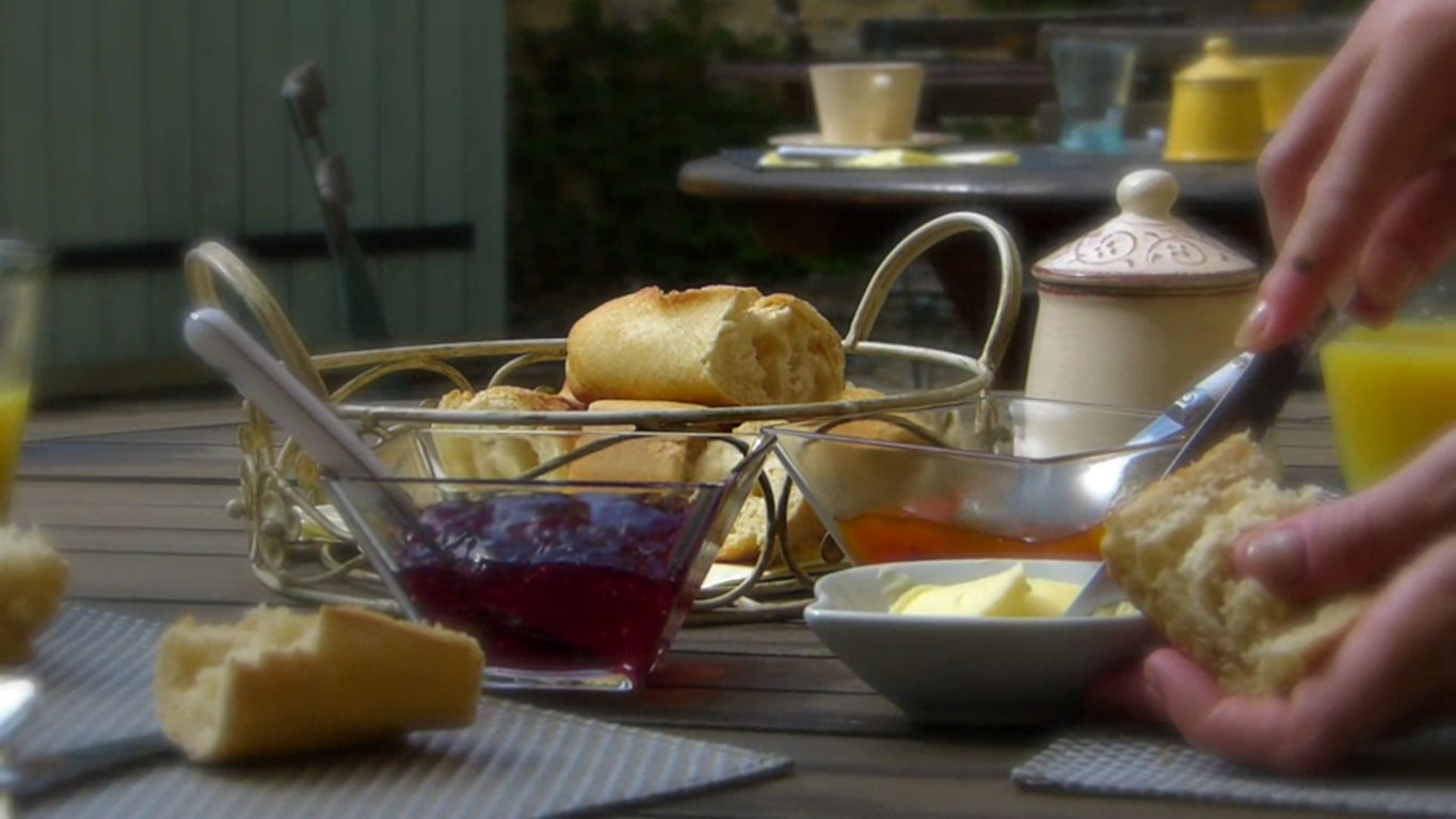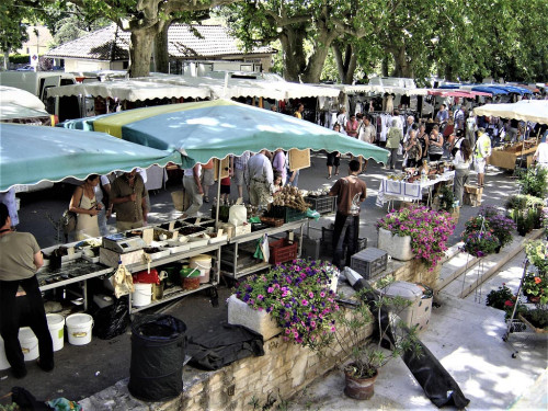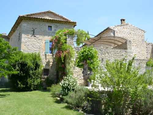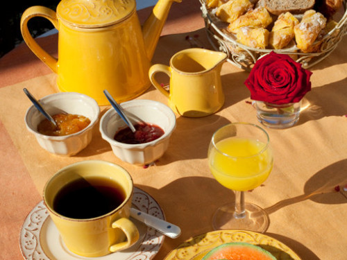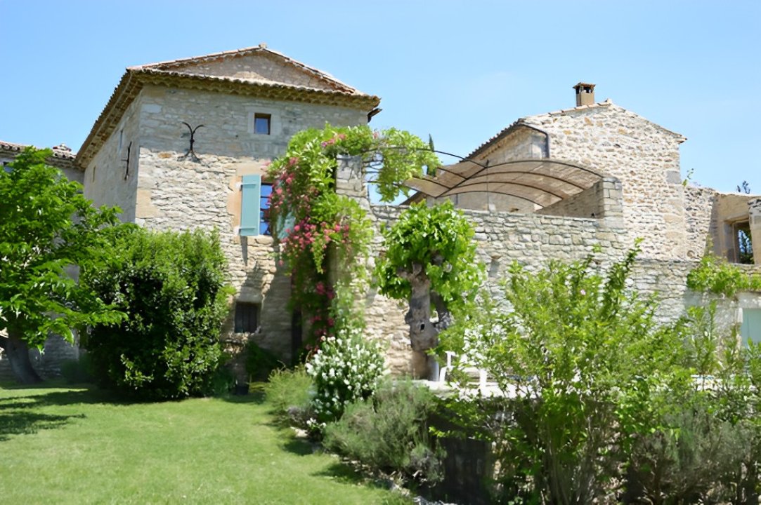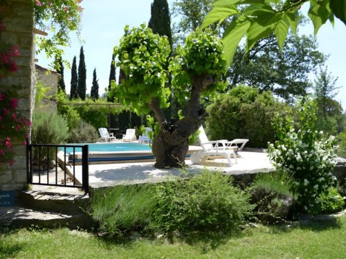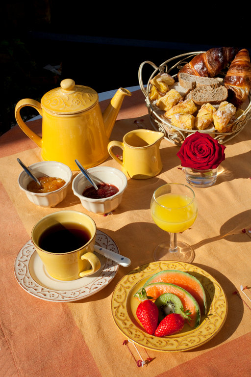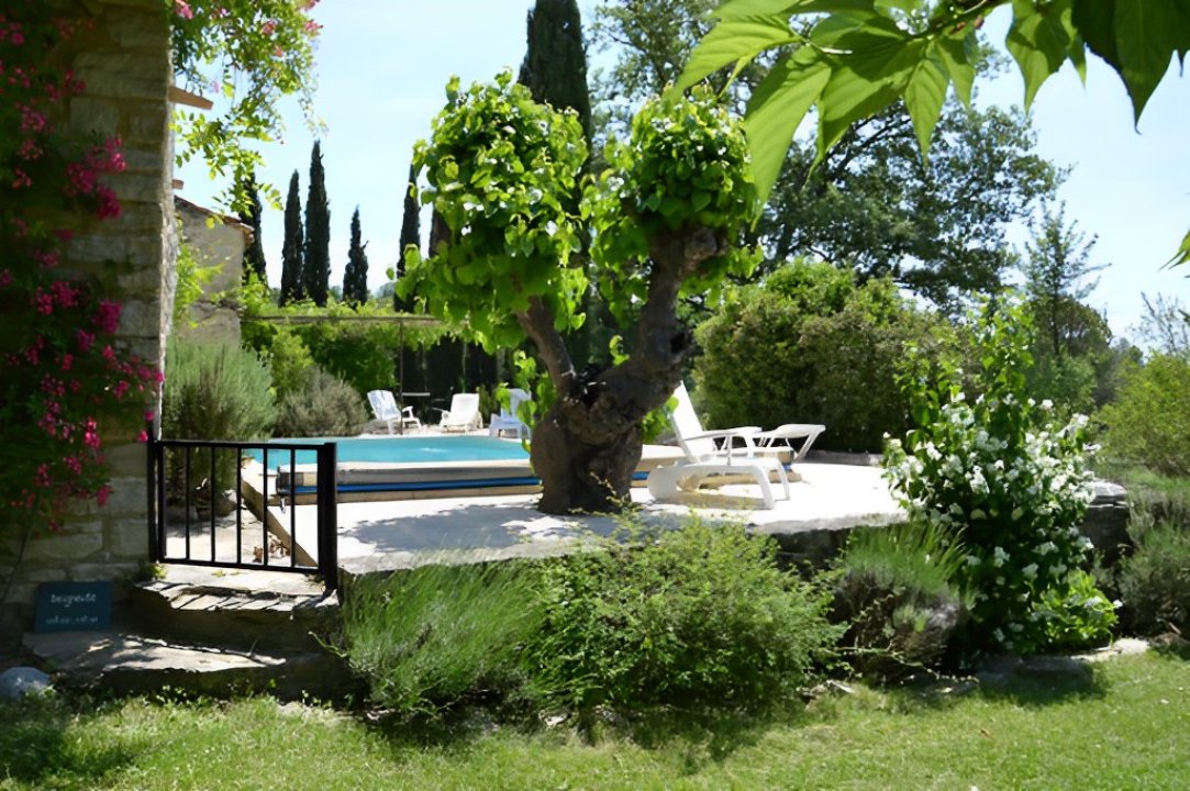 Petite terrasse entourée des rosiers avec table et chaises donnant sur cour intérieure fleurie.