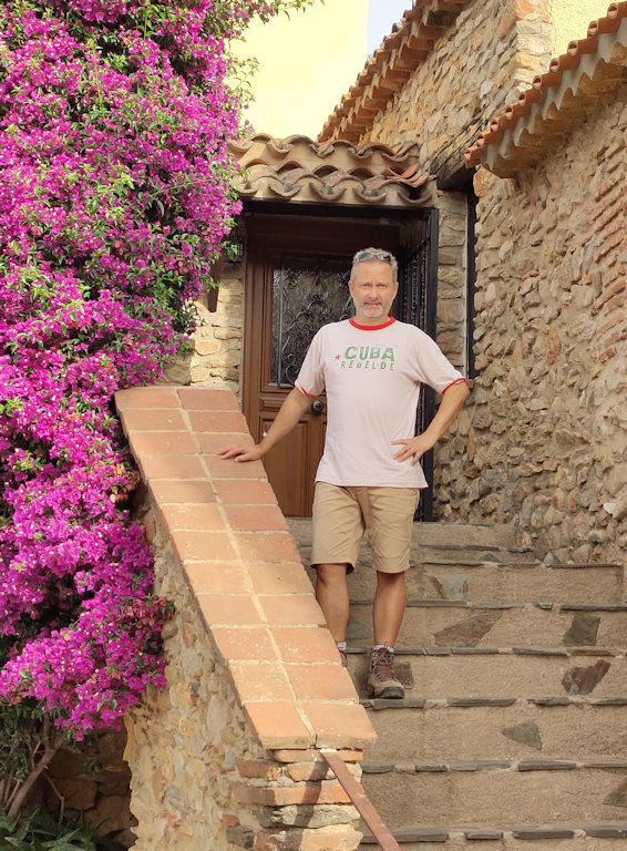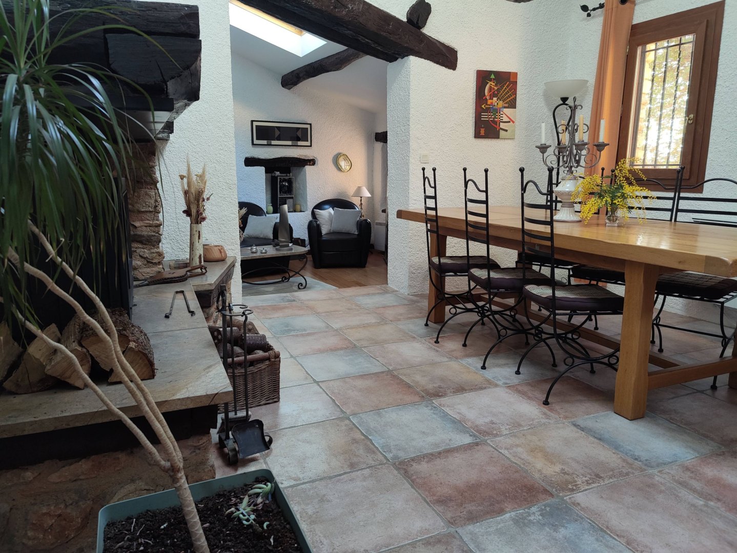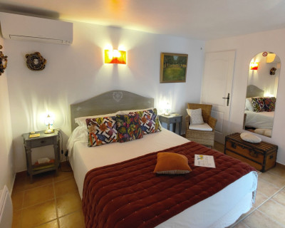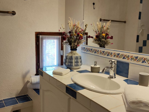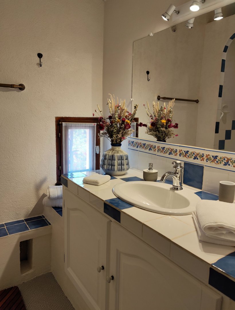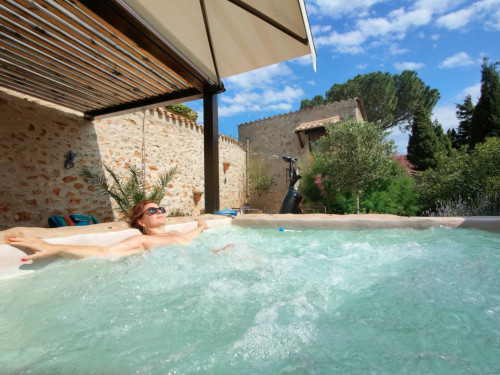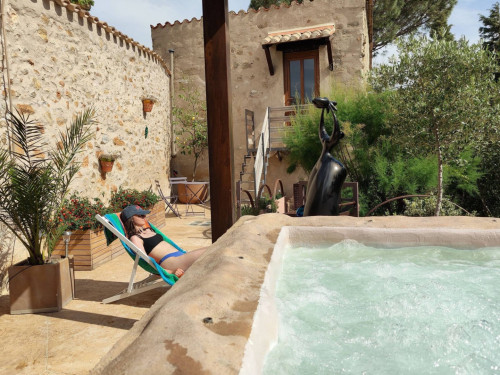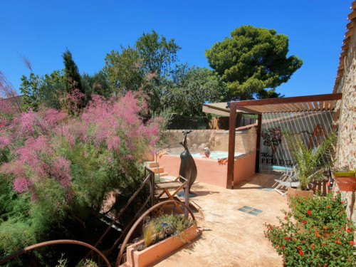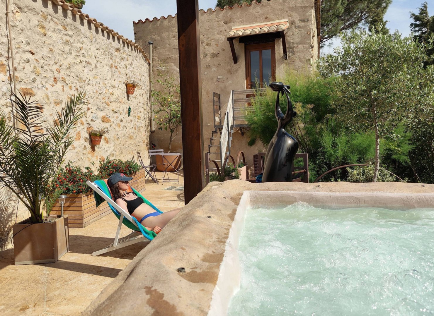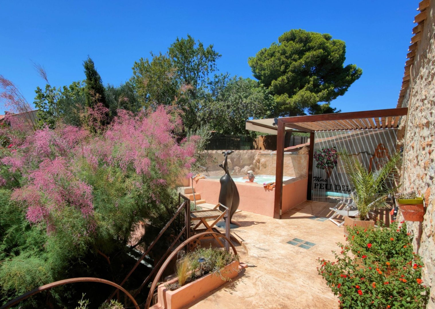 Petit salon de jardin dans la cour-jardin entourée de murs, à l'espagnole