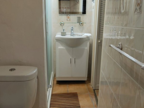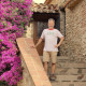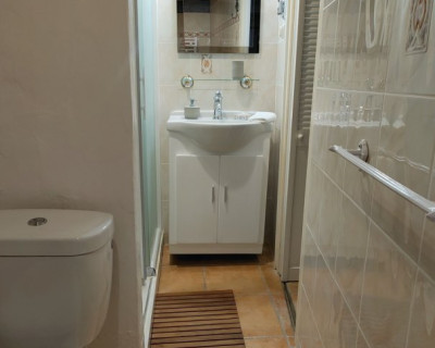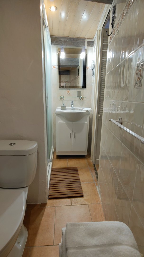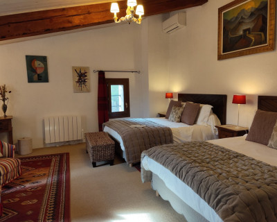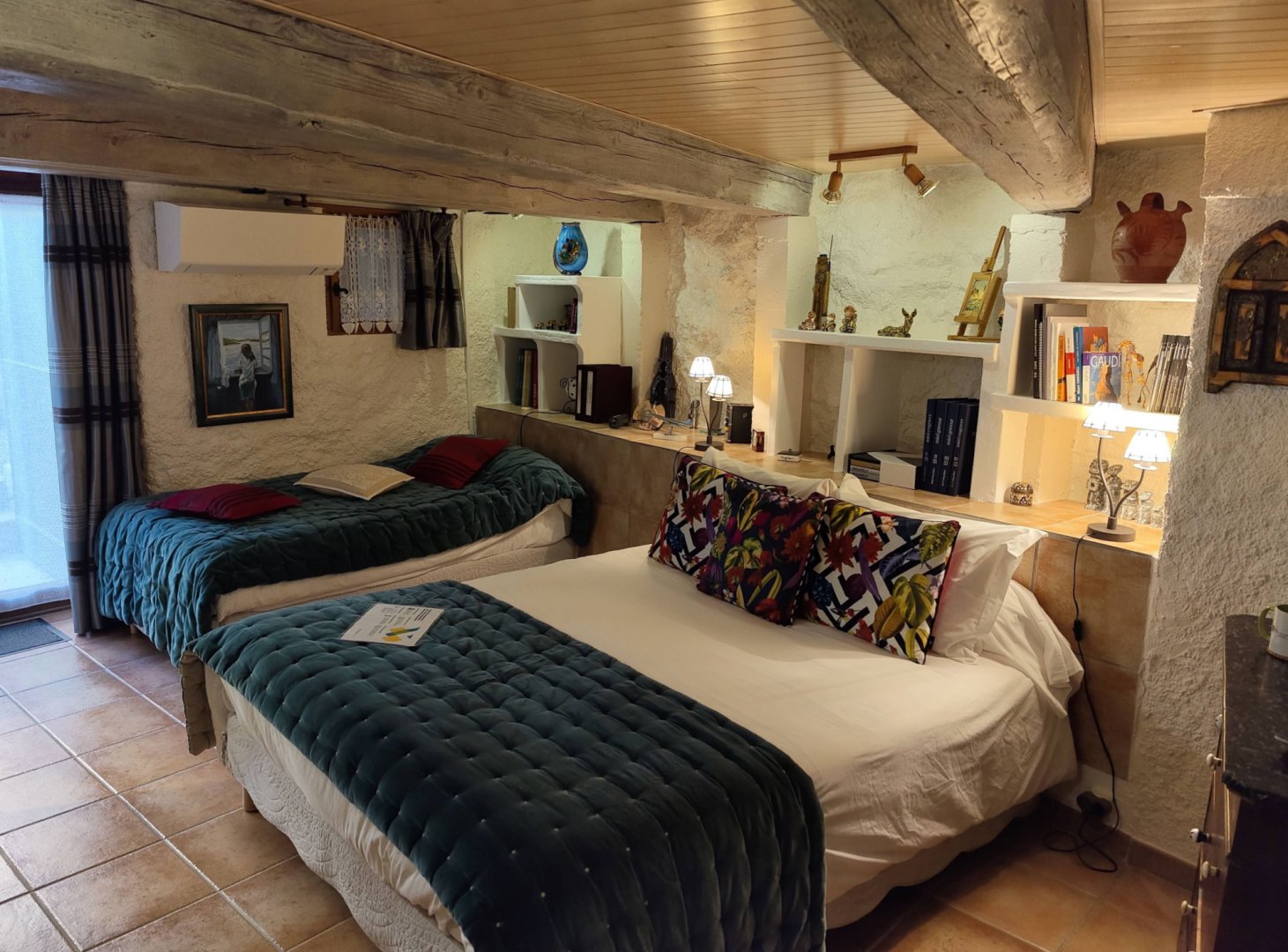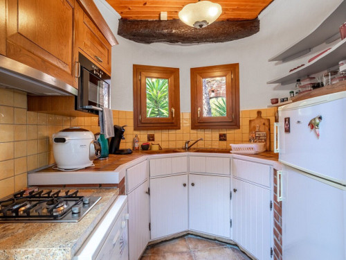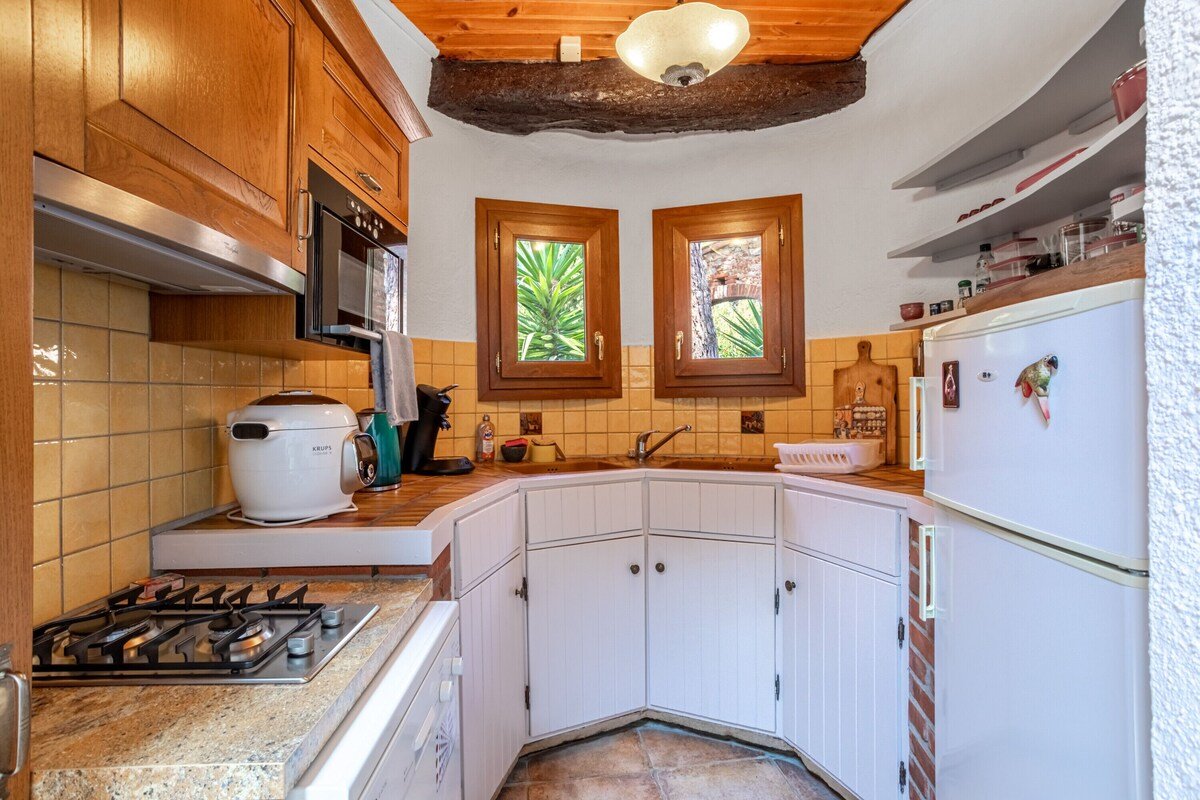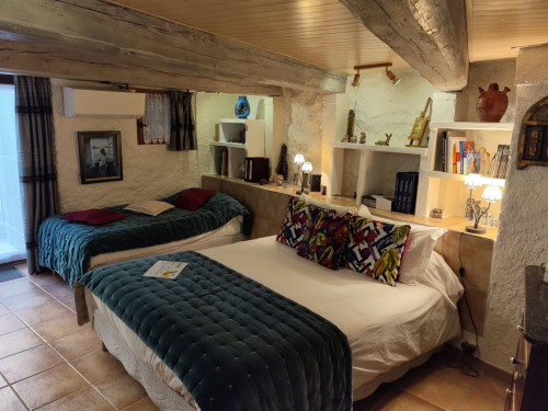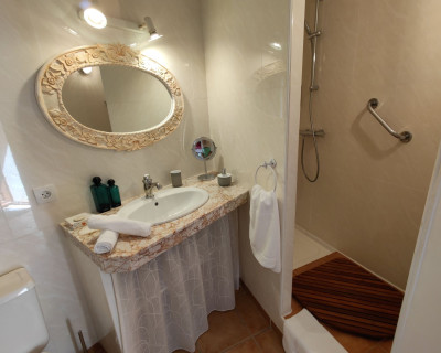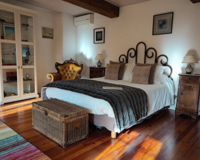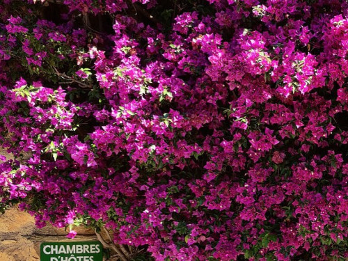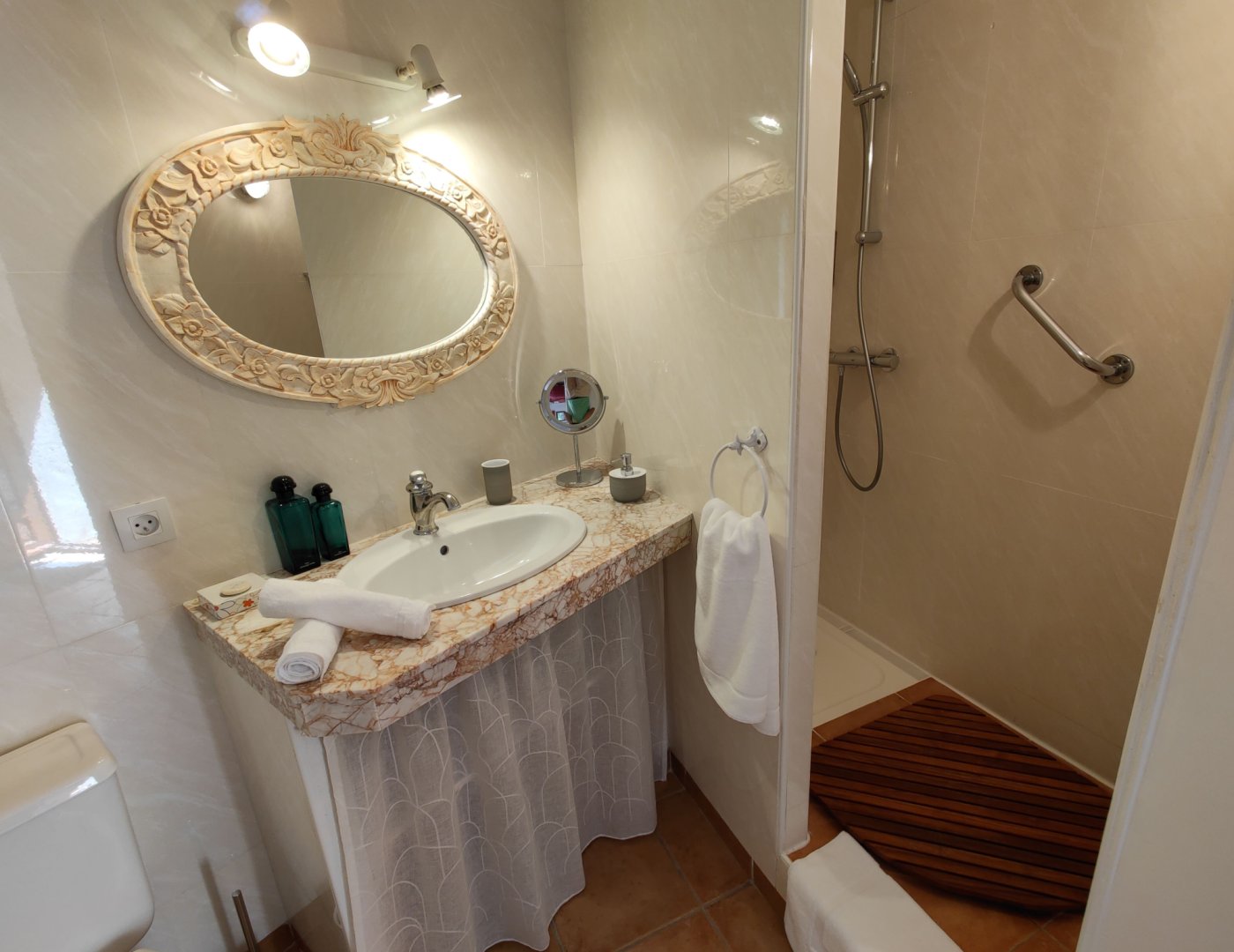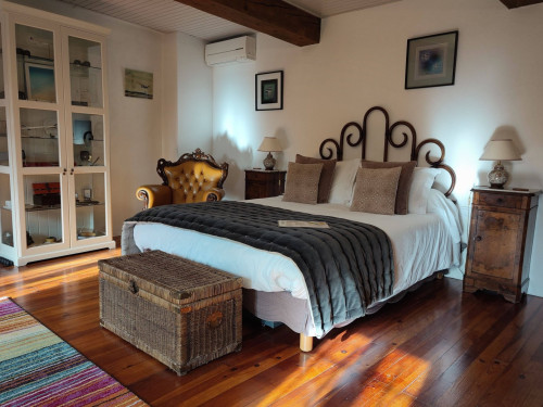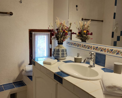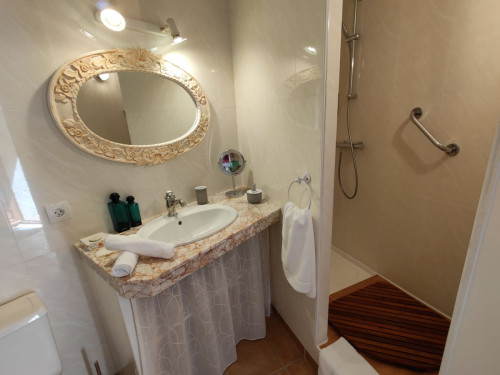 Petit salon de jardin dans la cour-jardin entourée de murs, à l'espagnole