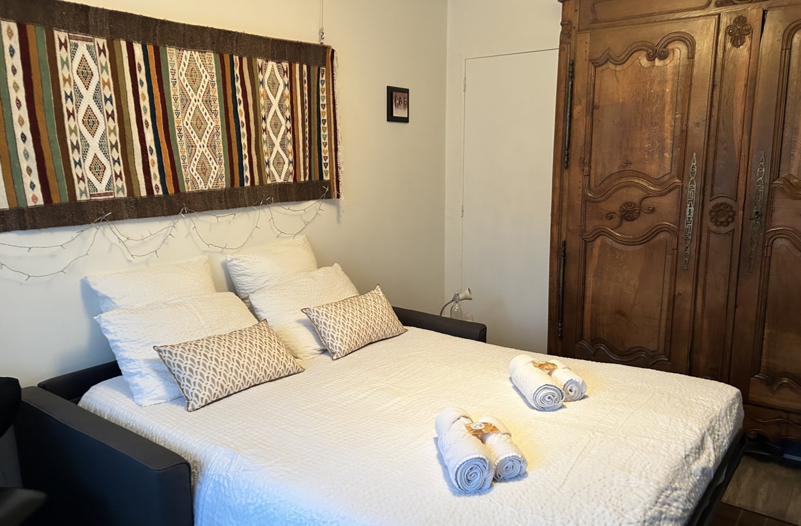 Pour une 5ème personne ou autre couple, un canapé-lit confortable dans un espace isolé du séjour.
