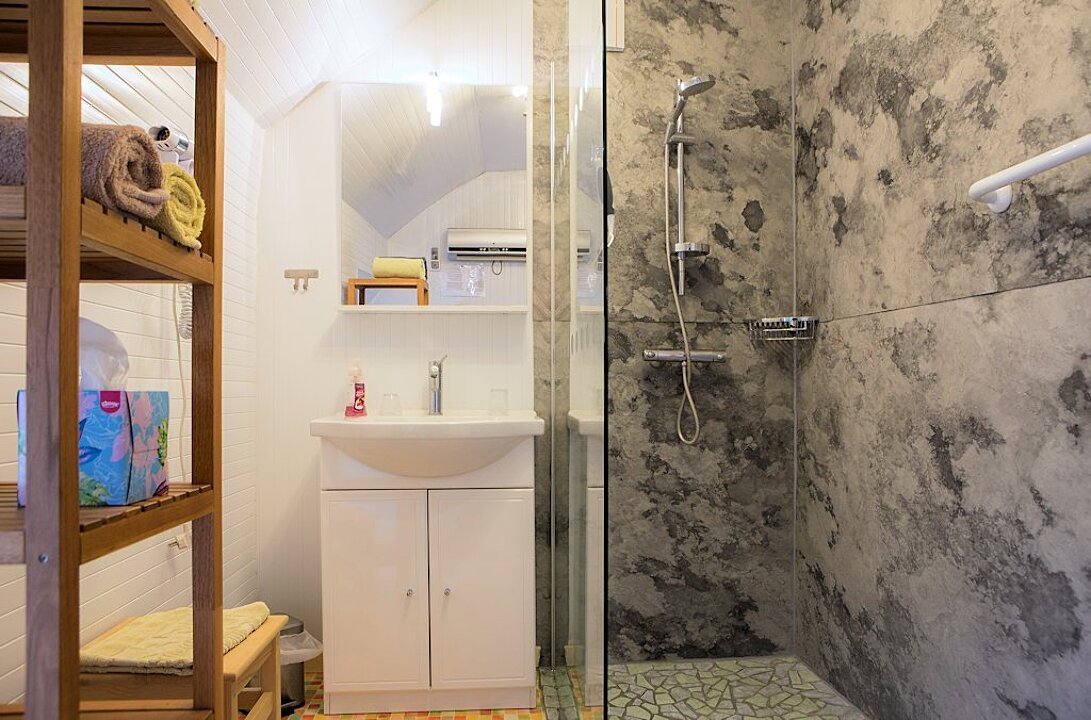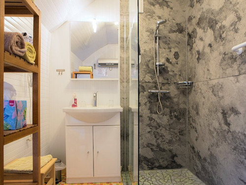 1 chambre avec un lit 2 personnes, salle de bain, WC